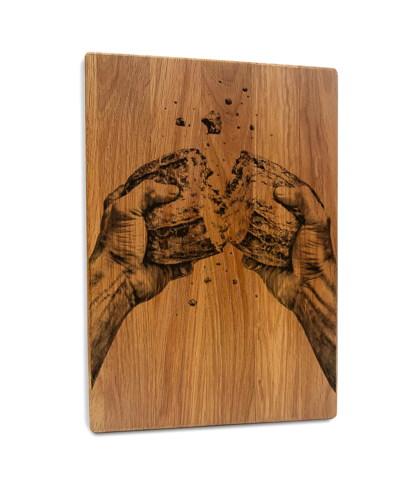 Stilinga pjaustymo lentelė "Duona CB-2645" išsiskiria meniniu graviravimu, vaizduojančiu rankomis laužomą duoną. Šis motyvas pabrėžia natūralią medžio tekstūrą ir primena apie dalinimąsi bei bendrystę. Tai dizainas, sukurtas vertinantiems autentiškumą ir šiltas akimirkas prie bendro stalo.