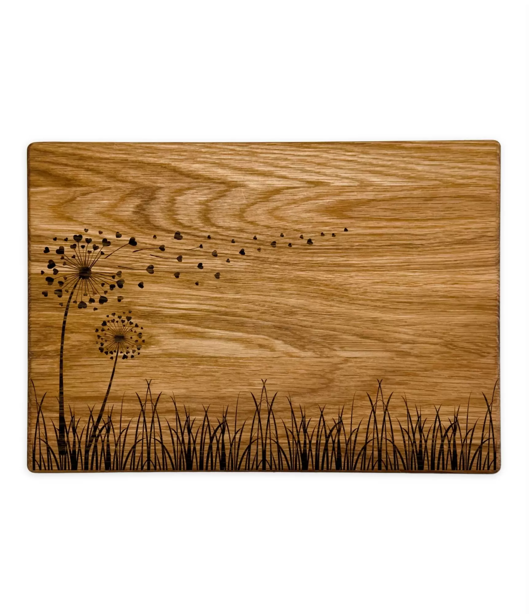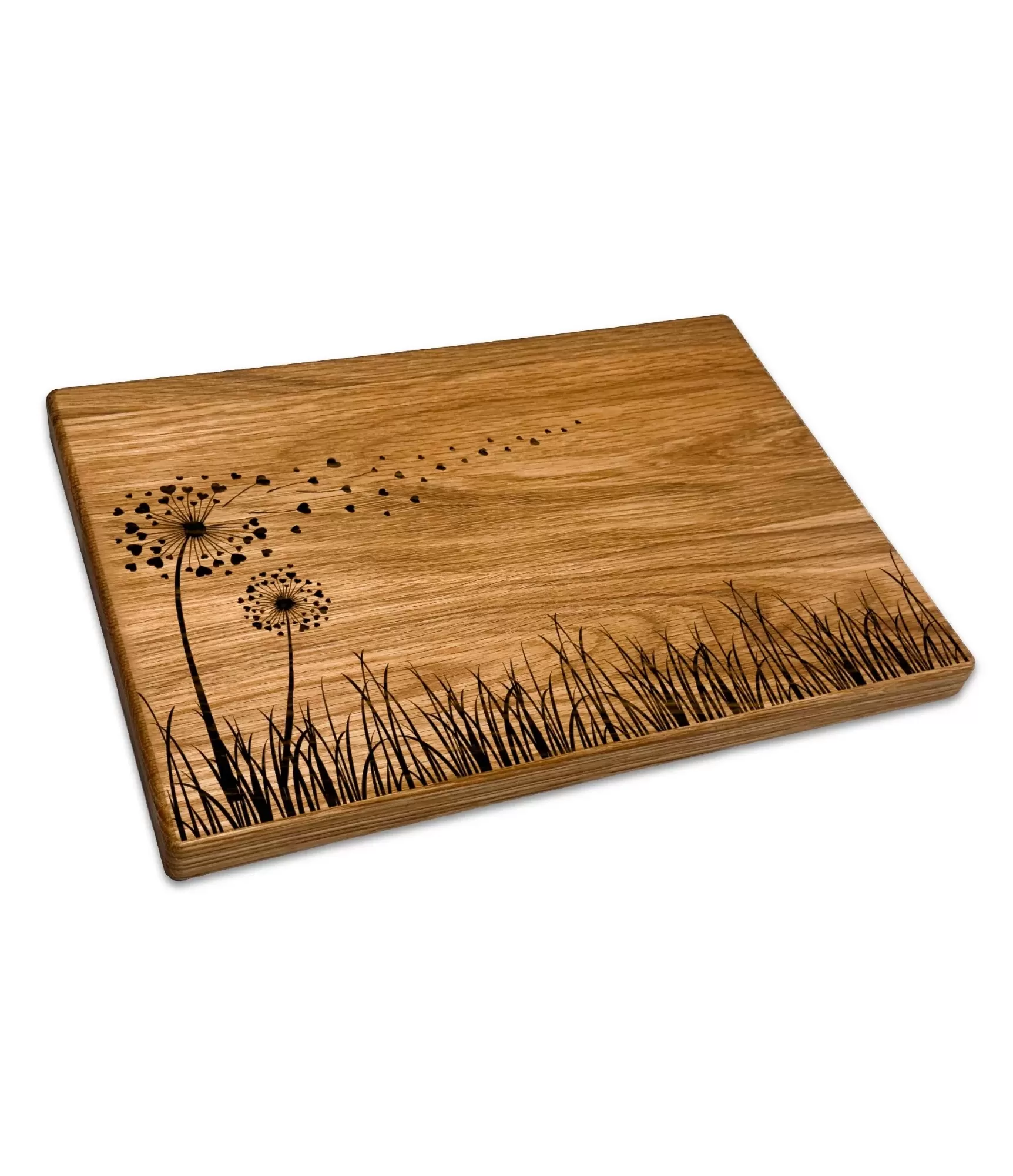 Stilinga medinė pjaustymo lentelė "Kiaulpienė CB-26P5" išsiskiria lengvu ir estetišku kiaulpienių dizainu, kuris suteikia gaminiui subtilumo ir natūralumo. Išsiskleidę pūkai, vėjo nešami per visą paviršių, kuria lengvumo įspūdį ir suteikia vizualinio judesio. Tai ne tik praktiškas gaminys, bet ir stilingas virtuvės akcentas, kuris įneša daugiau jaukumo į kasdienę aplinką. Lentelę galima naudoti gaminti maistą vienoje pusėje, o kitoje patogiai patiekti užkandžius ar serviruoti stalą.
