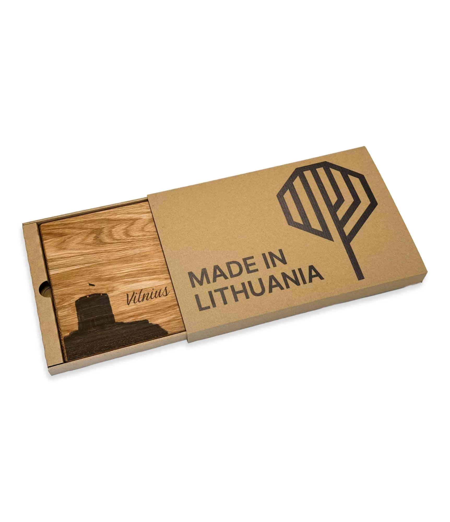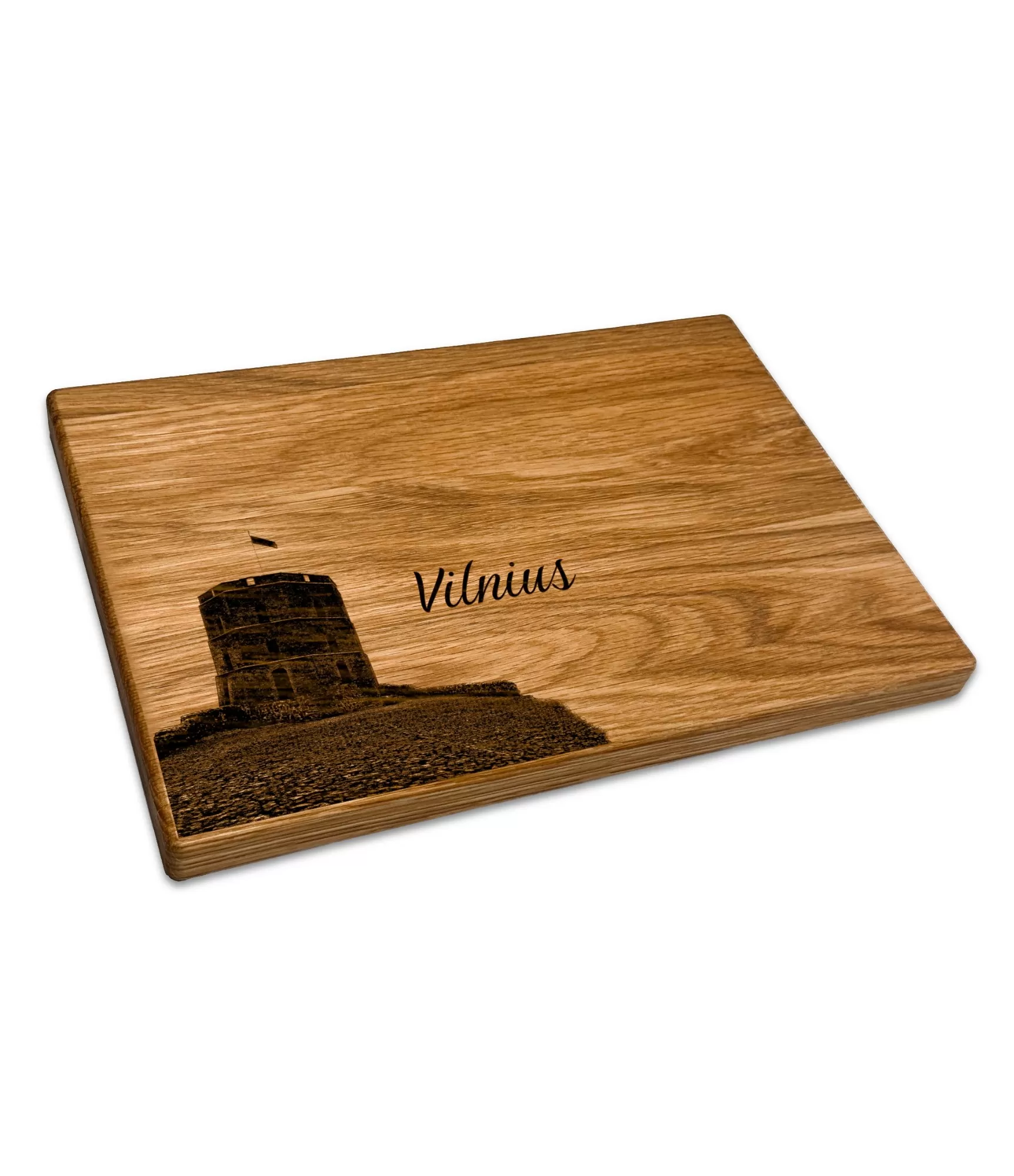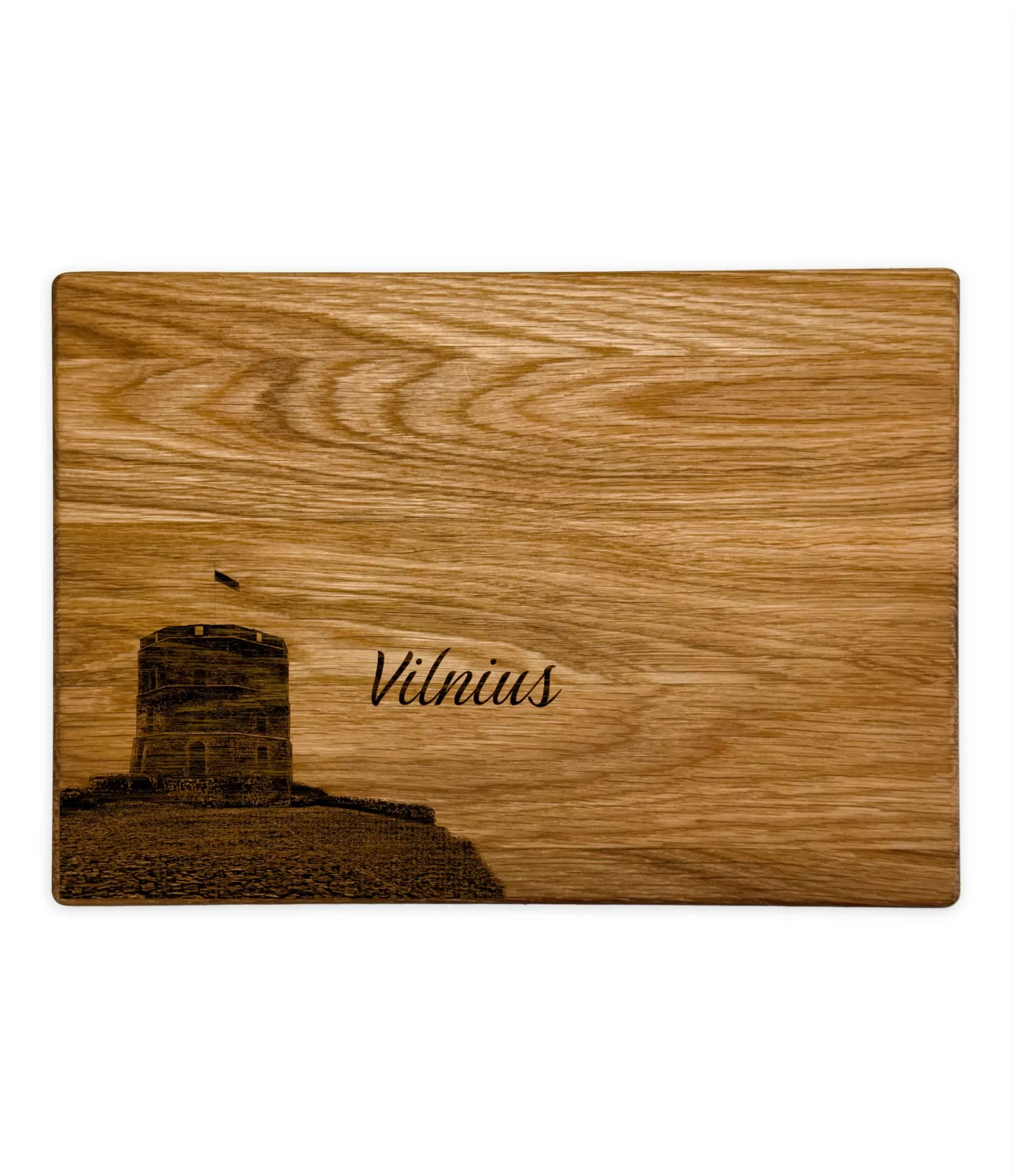 Medinė pjaustymo lentelė su graviūra "Vilnius CB-2625" išsiskiria minimalistiniu, tačiau prasmingu dizainu. Joje vaizduojamas Gedimino pilies bokštas – vienas svarbiausių sostinės simbolių, atspindintis miesto istoriją ir tapatybę. Šalia esantis užrašas "Vilnius" suteikia gaminiui aiškų identitetą ir leidžia lengvai atpažinti šį išskirtinį miesto akcentą.