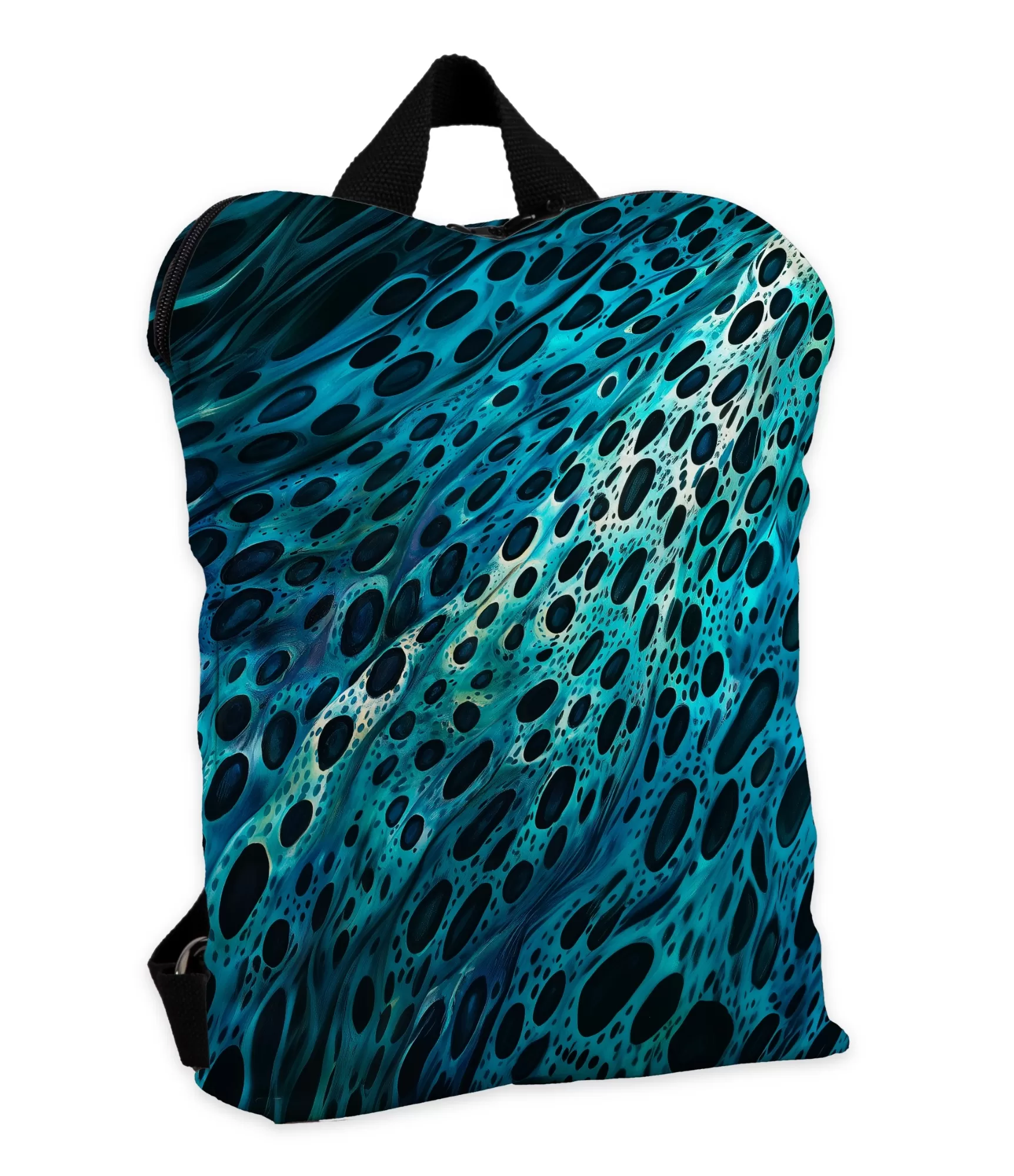 Ši moteriška kuprinė iš karto patraukia akį savo drąsiu ir dinamišku dizainu, kuriame išryškėja abstrakti gyvūno kailio tekstūra. Dominuoja žalsvai mėlyni pustoniai, per kuriuos tarsi srovena vandens srovė ar vėjyje besiplaikstantis kailis. Tamsūs ovalūs raštai pereina iš tankesnės į šviesesnę zoną, primindami naktinio geopardų kailio iliuziją – laukinę, bet rafinuotą. Kontrastingos spalvos ir vizualinis judesys sukuria įspūdį, kad kuprinė nuolat gyva, nuolat judanti. Tai ne tik aksesuaras, tai – pareiškimas apie moters vidinę stiprybę, laisvę ir kūrybišką požiūrį į gyvenimą.