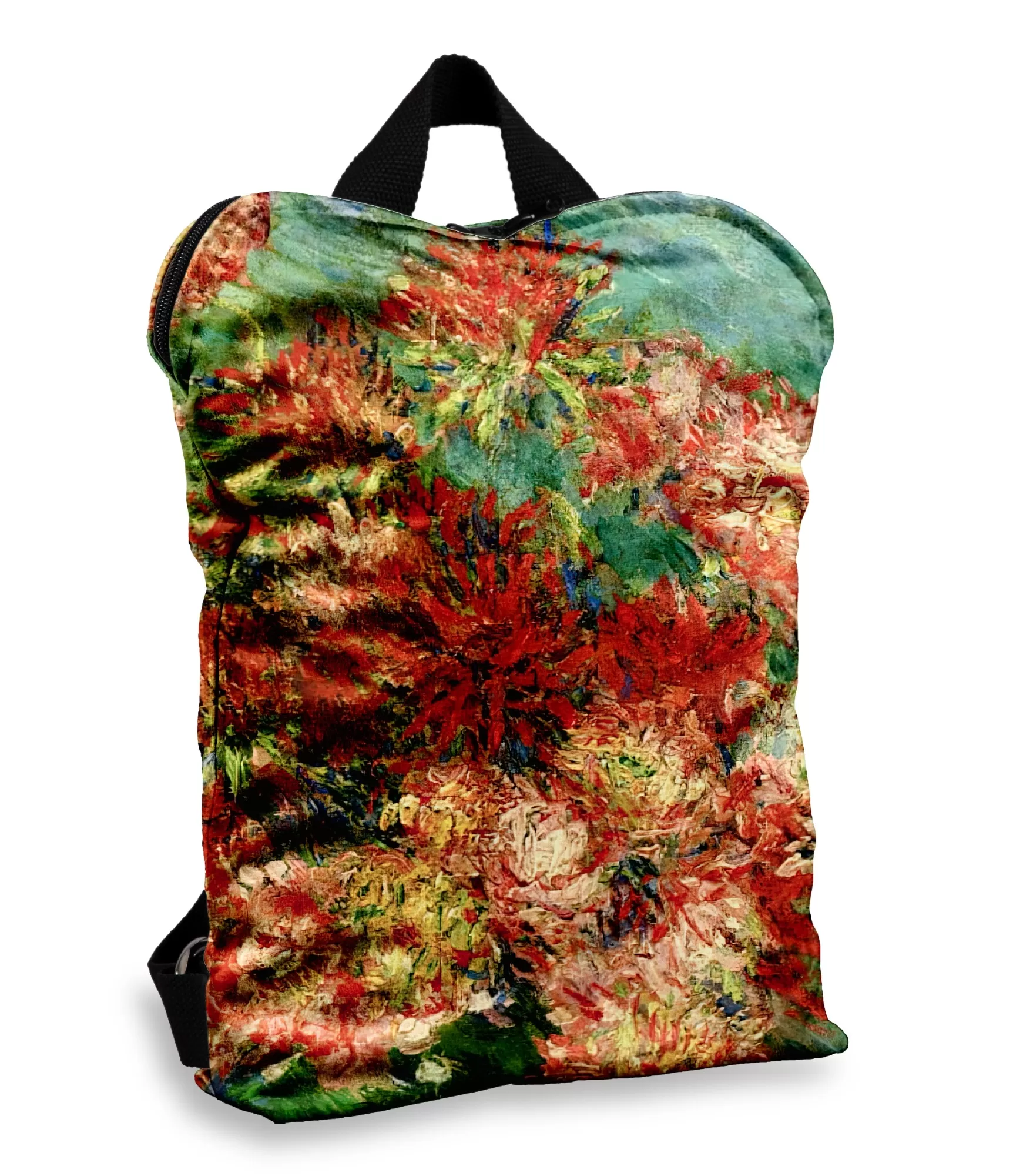 Claude Monet – impresionizmo meistras, kurio tapyba ne tik atvaizduoja gamtą, bet ir perteikia nuotaiką. „Vaza su chrizantemomis“ – tai ne tiesiog gėlių natiurmortas, bet rami, spalvinga tyla. Šiame kūrinyje žiedai spindi įvairiomis spalvomis – nuo baltos iki alyvinės – kurdami emocinį foną, kuris perkeltas ant kuprinės tampa nešiojamu meno kūriniu.