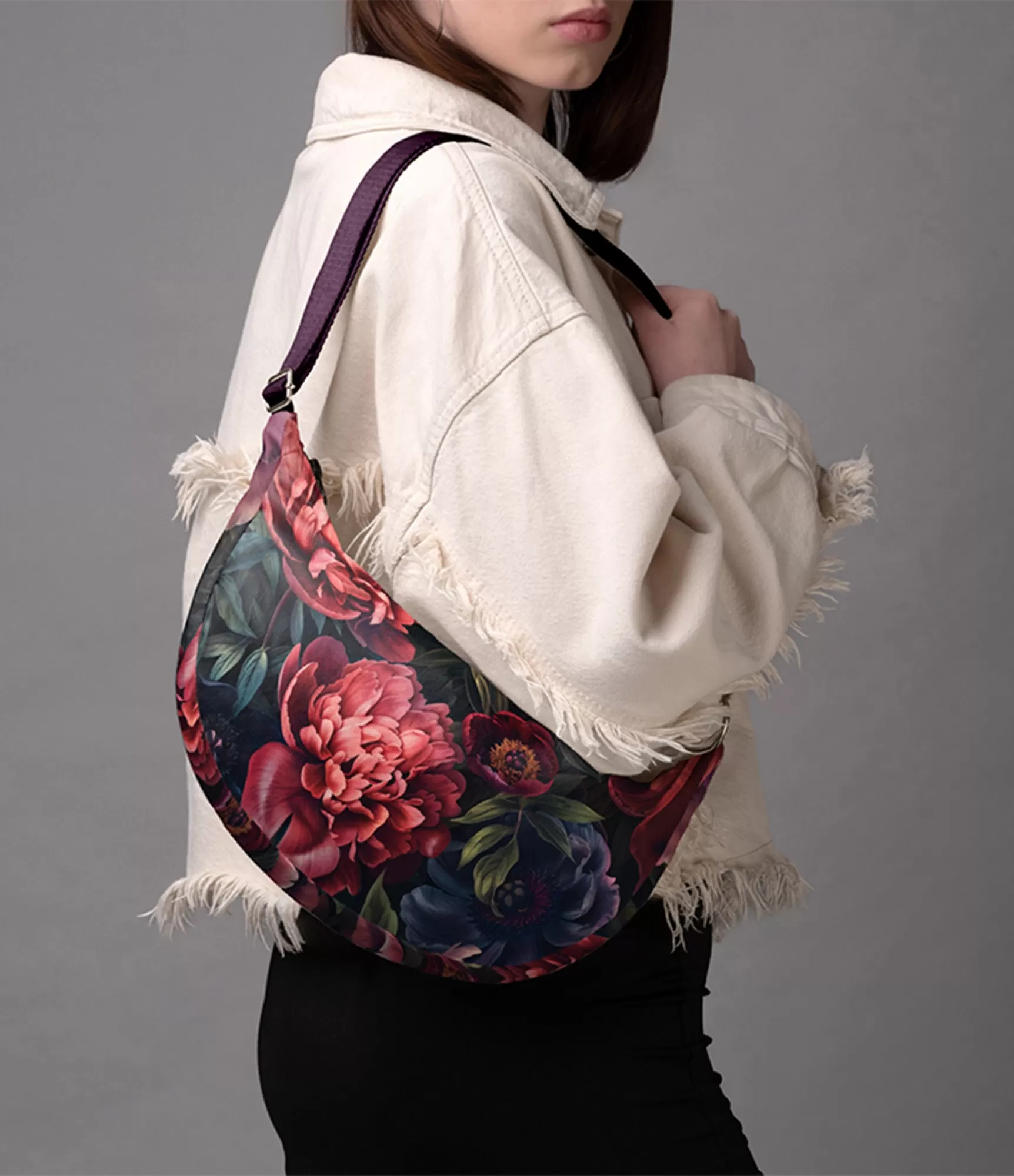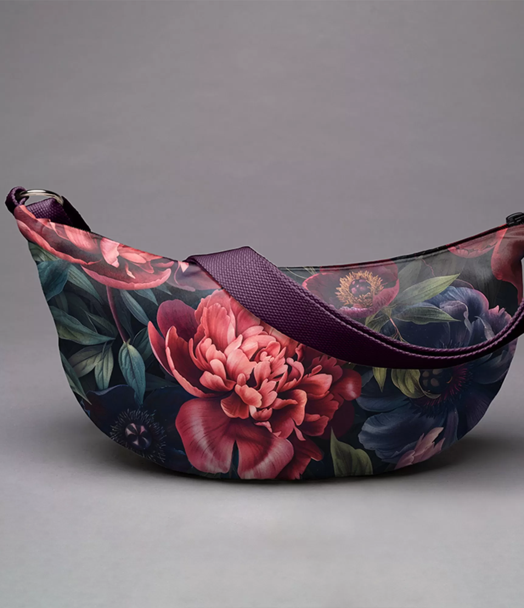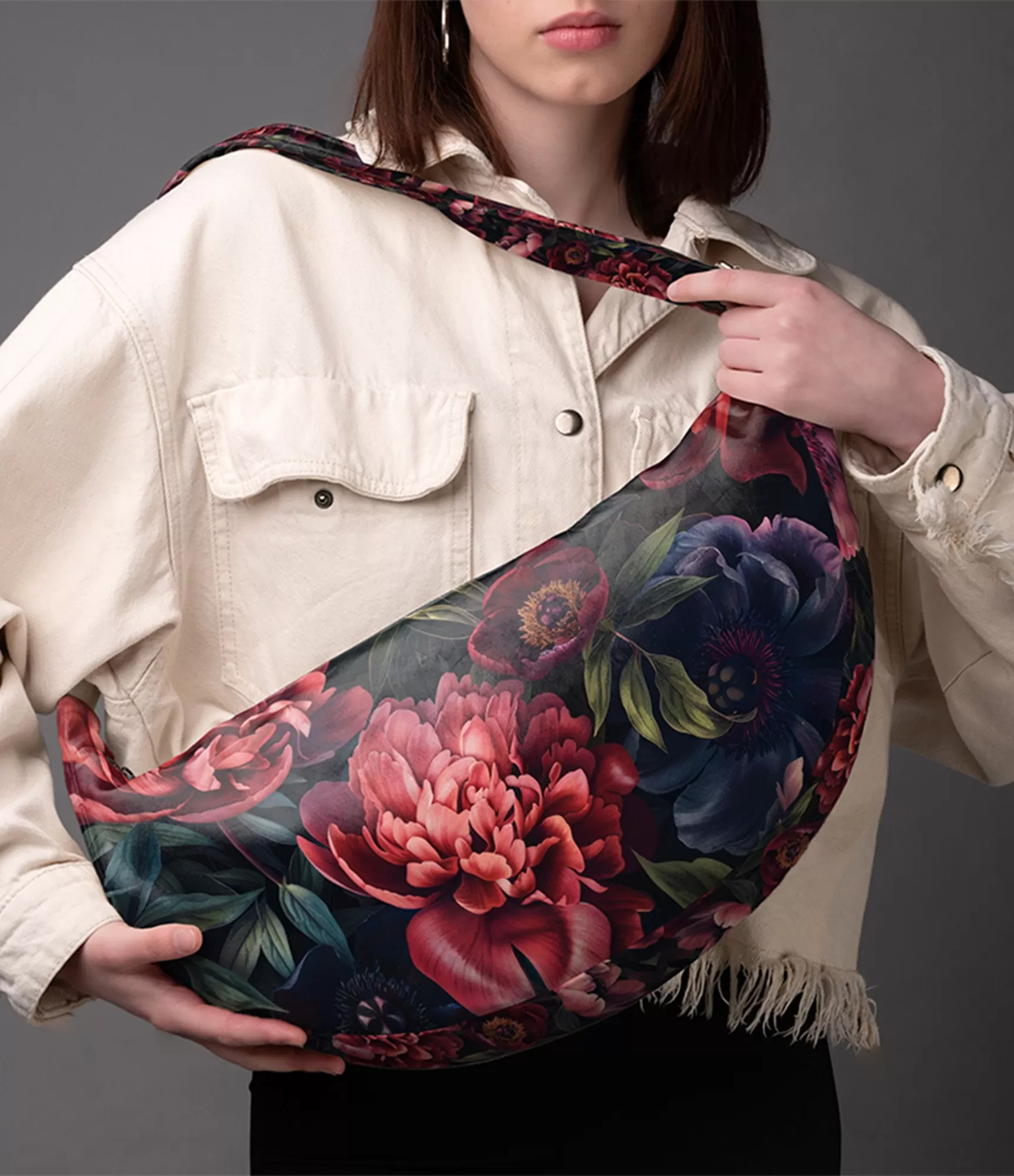 Rankinė su bijūnais ant tamsaus fono išsiskiria ryškių žiedų kontrastu, suteikiančiu jai dramatiškumo ir elegancijos. Šis aksesuaras puikiai tinka tiek kasdieniam naudojimui, tiek ypatingoms progoms, kai norisi pridėti spalvų į savo įvaizdį. Tamsus fonas pabrėžia bijūnų grožį, sukurdamas įspūdingą ir stilingą akcentą jūsų aprangai.