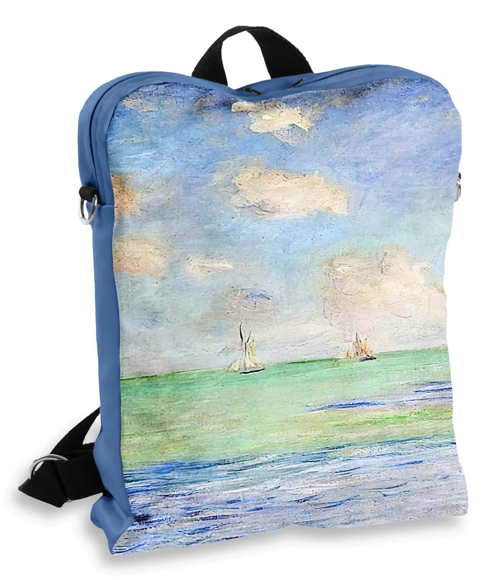 Claude Monet savo paveiksluose gaudė ne daiktus, o būsenas. „The Sea at Pourville“ – tai ne geografija, o pojūtis. Jį puikiai perteikia šios kuprinės dizainas. Kai ją užsidedi, tai tarsi leidi sau keliauti – ne per kilometrus, o per emocijas. Tai kvietimas žiūrėti giliau, matyti daugiau, gyventi šviesiau.