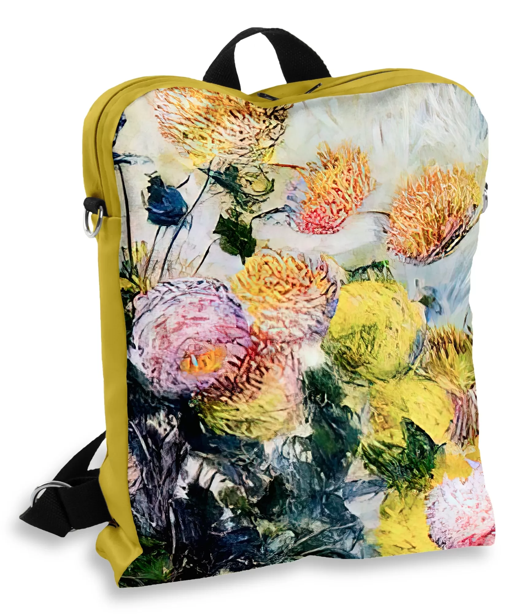Ši moteriška kuprinė su Claude Monet paveikslu „Dahlias“ – tai tarsi žydintis sodas ant tavo pečių. Kai kasdienybėje ima trūkti spalvų, kai norisi šviesos ir gyvybės, kuprinė tampa ne tik stiliaus detale, bet ir emociniu peizažu. Monet gėlių kompozicija čia virsta kasdieniu džiaugsmo šaltiniu – nešiojamu paveikslu, kuris kalba apie vasaros prisiminimus, lengvą vėją ir sodrią gamtos energiją.