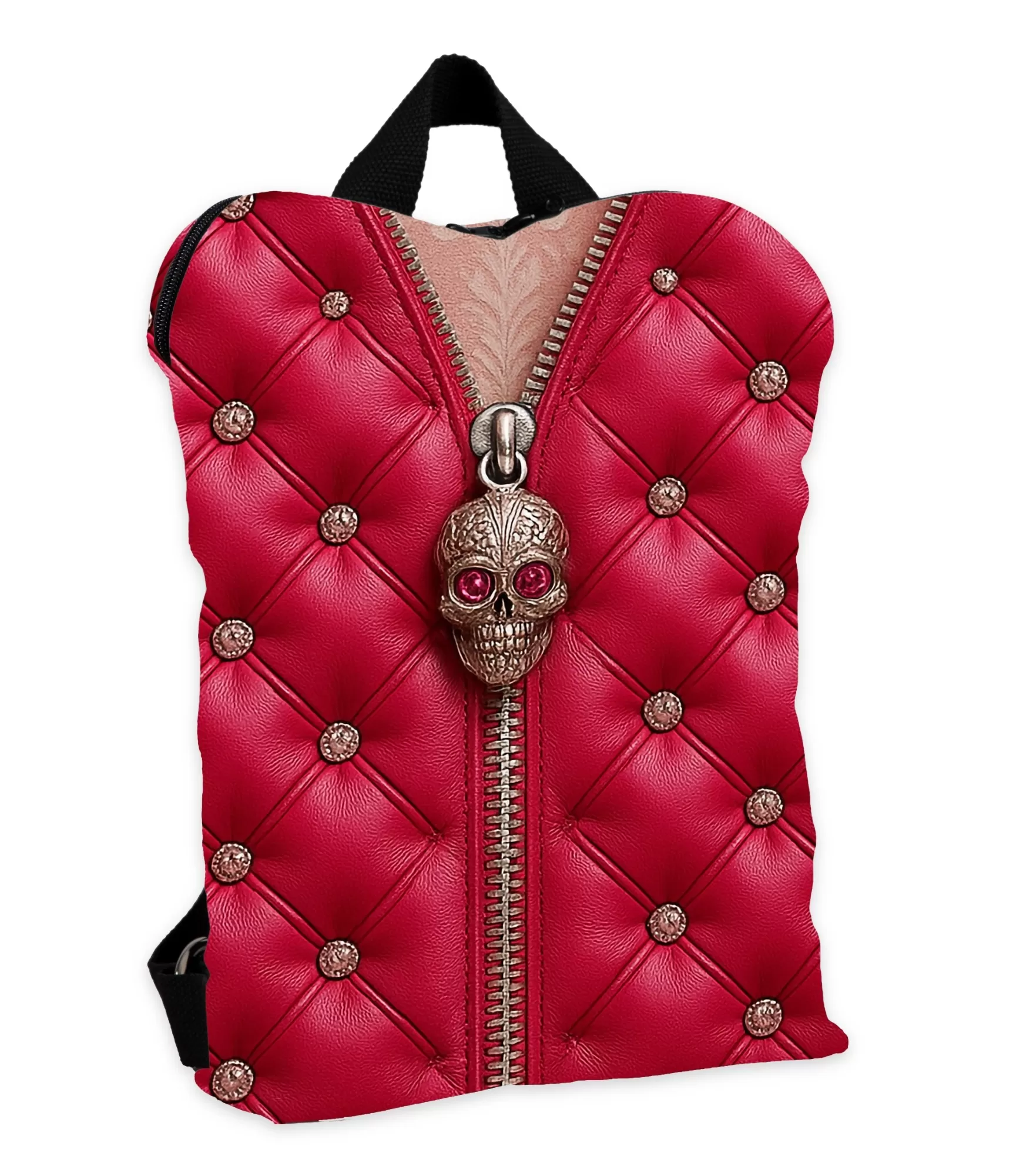 Kartais norisi, kad kuprinė kalbėtų už tave. Kad vienu žvilgsniu parodytų tavo charakterį, stiliaus pojūtį ir drąsą būti kitokiu. Būtent tokia yra ši kuprinė – išskirtinis aksesuaras, skirtas tiems, kurie mėgsta kontrastą tarp klasikinio rašto ir maištingo akcento. Raudonas odos imitacijos fonas primena prabangius baldų apmušalus, siuvinėjimo imitacija su sagomis sukuria gylio ir tekstūros įspūdį. Bet visa tai perkerpa centrinis užtrauktukas su masyvia metaline kaukole – drąsus ir netikėtas dizaino pasirinkimas, kuris iškart patraukia dėmesį.