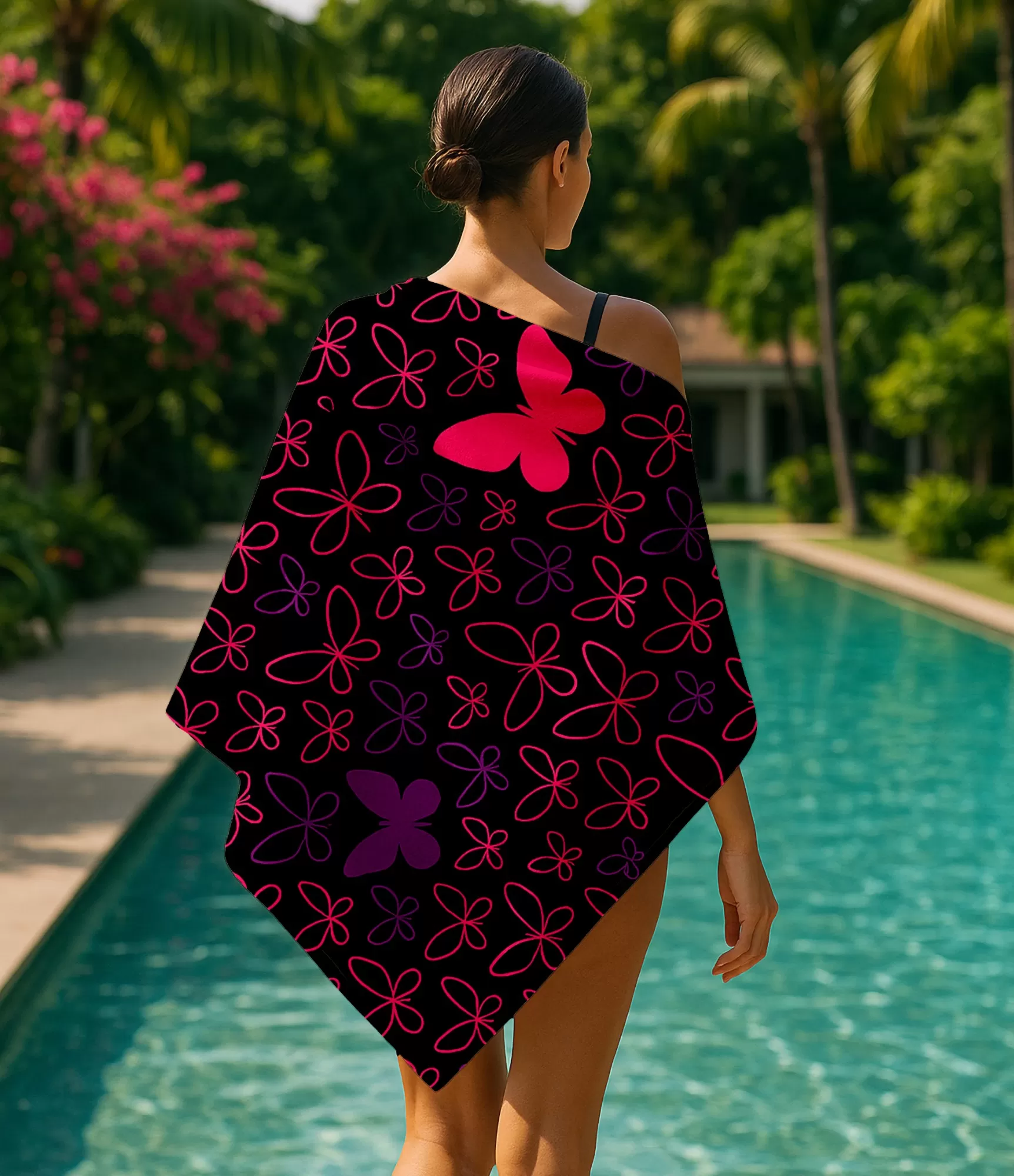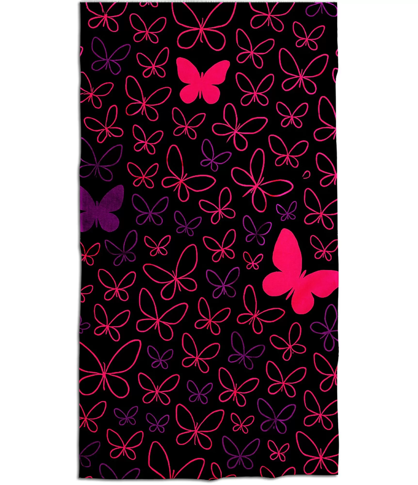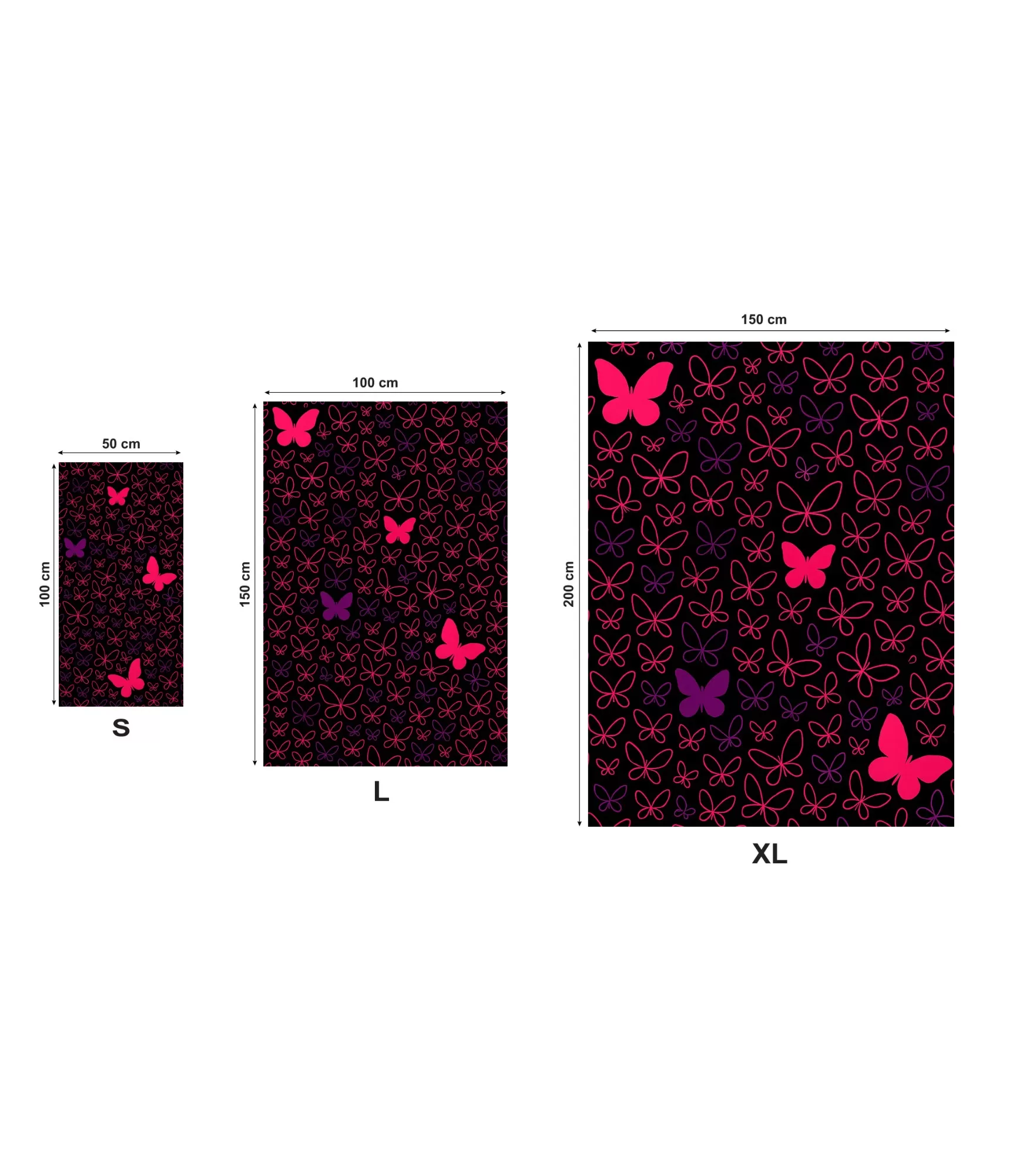Ryškus kontrastas tarp juodo fono ir neoninių drugelių siluetų iš karto patraukia akį. Tai ne tik paplūdimio rankšluostis – tai stiliaus pareiškimas, drąsus, bet tuo pačiu elegantiškas akcentas kiekvienam, kuris mėgsta išsiskirti. Rožiniai ir purpuriniai drugeliai, lyg švytintys ore, sudaro judėjimo ir laisvės įspūdį, o jų linijos primena skriejančias mintis ar atostogų prisiminimus, kurių nesinori paleisti. Visa kompozicija pulsuoja energija, tačiau išlieka harmoningai išdėstyta – tarsi vasaros nakties šokis, kai dangus nusidažo tamsiai mėlyna, o virš galvos ima mirgėti svajonių formos.