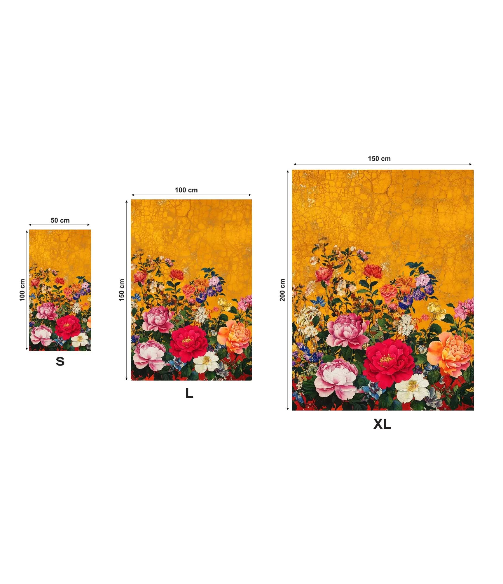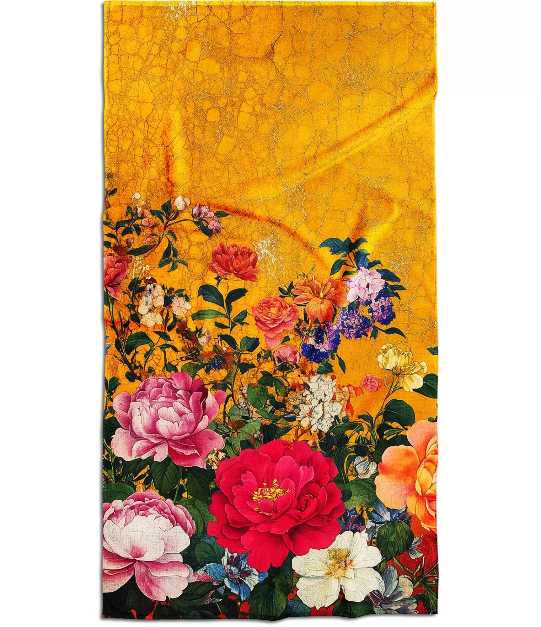 Ryškus it saulės prisilietimas, šis rankšluostis tarsi perkelia į gėlių sprogimo vidurį. Auksinis fonas primena seną nutapytą paveikslą su subtiliais įtrūkiais, lyg laiko paliesta drobė. Tačiau iš šios istorinės geltonos lyg išsiveržia gyvybės kupinas sodas – didelės raudonos, rausvos, oranžinės, violetinės ir baltos gėlės dygsta nuo apačios, užimdamos visą kompozicijos apatinę dalį. Kiekvienas žiedas čia – tarsi atskiras potėpis, išdidintas iki maksimalaus grožio, spalvingumo ir detalių. Gėlės atrodo beveik tikros, jų žiedlapiai slysta vienas per kitą, žaisdami šviesomis ir šešėliais, o žali lapai tarsi saugo jų ryškų trapumą. Viršutinė rankšluosčio pusė likusi tyčia tuščia – geltonas fonas leidžia kvėpuoti vaizduotei ir sukuria gražų kontrastą tarp šilumos ir žydėjimo. Kita rankšluosčio pusė – visiškai balta, medvilninė, pritaikyta šluostymuisi. Spaudos pusė, atspausdinta ant poliesterio, išlaiko itin ryškias spalvas ir piešinio aiškumą, todėl šis dizainas ne tik gražus, bet ir funkcionalus.