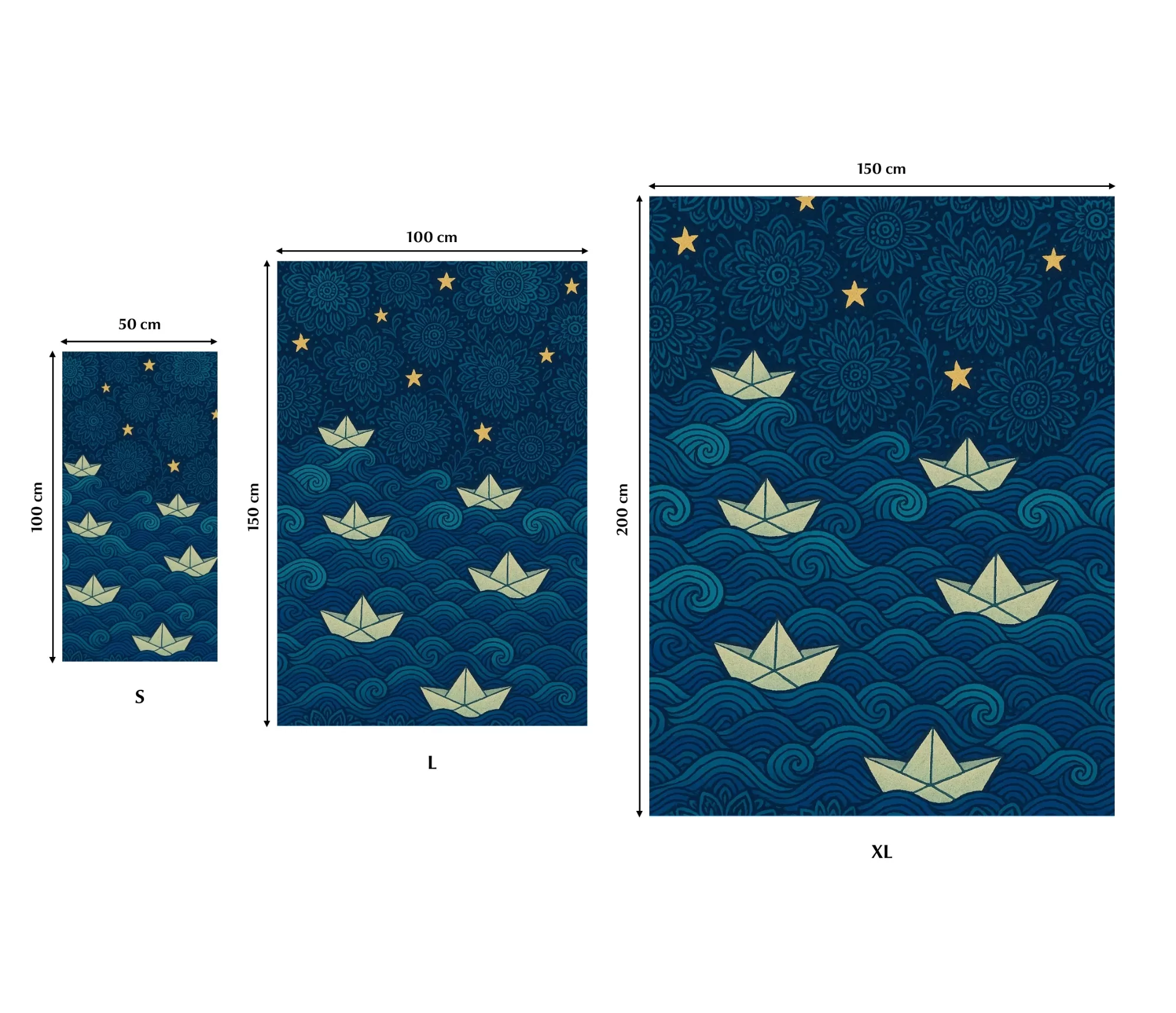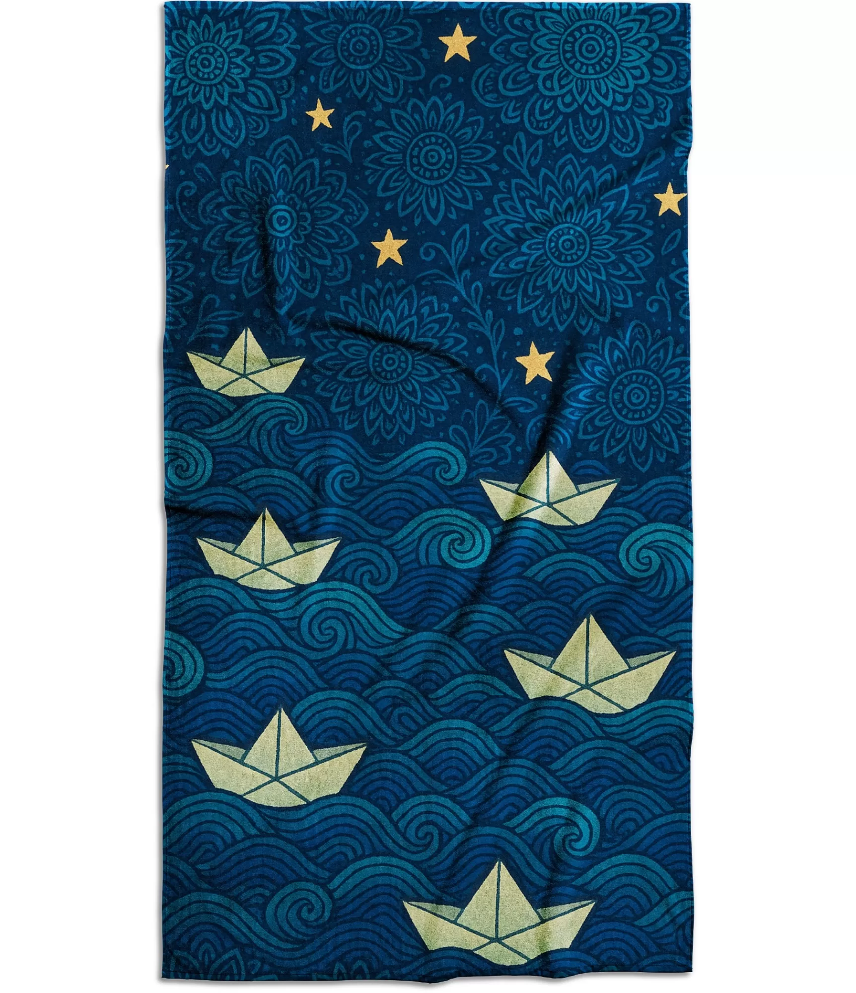 Naktis šiame rankšluosčio dizaine alsuoja ramybe – gilus mėlynas fonas virsta jūra, kurioje lėtai plūduriuoja popieriniai laiveliai. Virš jų – aukso spalvos žvaigždės ir grakštūs, augaliniais ornamentais žydintys dangūs. Tai nėra tik audinys – tai pasaka, kurią gali išsiskleisti ant smėlio, baseino kranto ar vonios grindų. Rankšluosčiai, sukurti iš tokių meniškų iliustracijų, įkvepia sustoti, pasvajoti ir pailsėti nuo skubos. Spalvų paletė čia subtiliai derina tamsius vandens tonus su ryškiais kontrastais – šviesūs laiveliai tampa švyturiais visoje kompozicijoje.