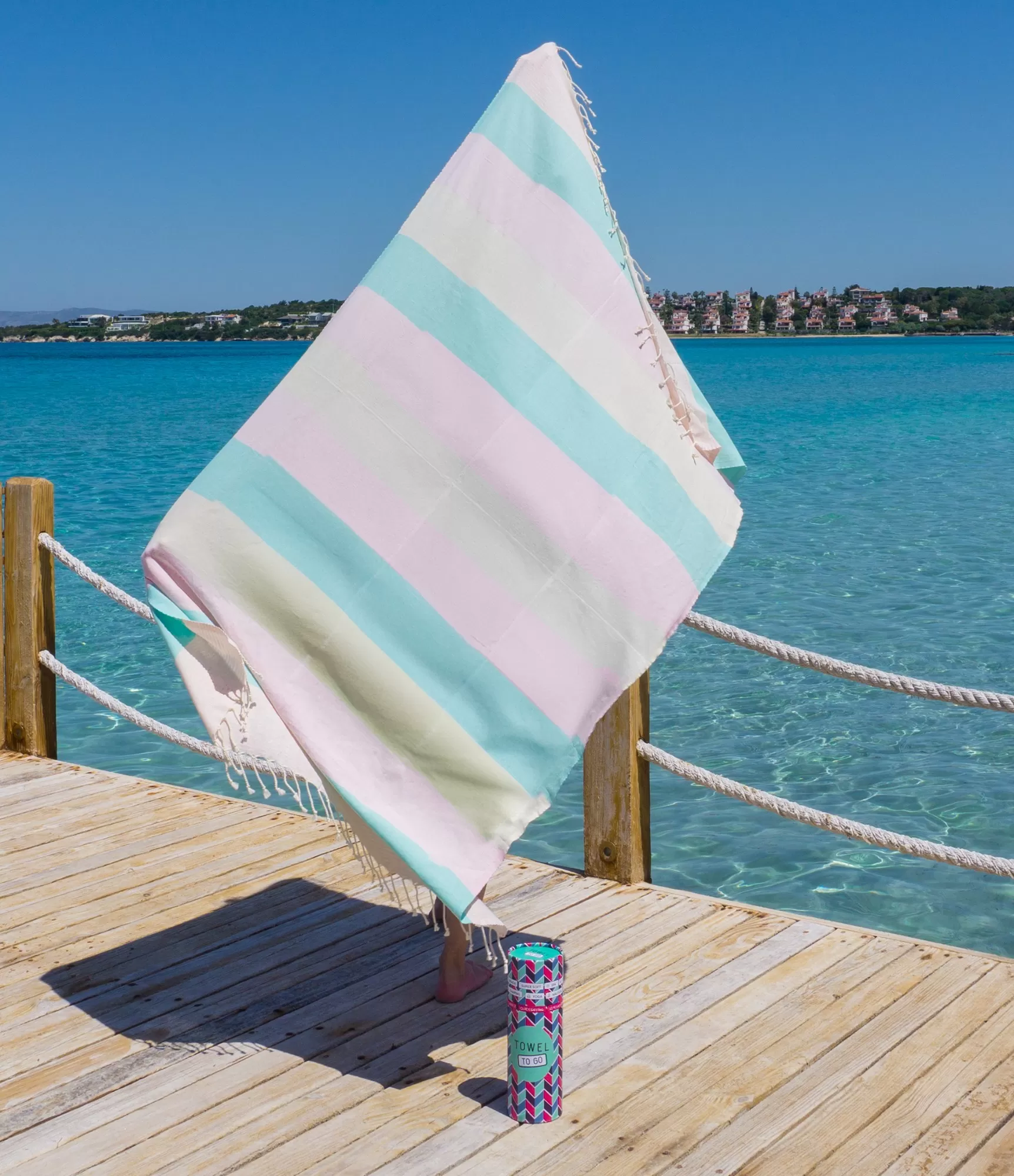 Šis rankšluostis yra ne tik gražus – jis ir nepaprastai švelnus. Pagamintas iš kokybiškos medvilnės, jis švelniai priglunda prie odos, o išdžiūsta greitai ir be pastangų. Jo plonumas nereiškia mažesnio funkcionalumo – priešingai, tai rankšluostis, kuris tave lydi nuo ryto iki vakaro. Jo išmatavimai pritaikyti tam, kad galėtum tiek užsikloti, tiek pasitiesi – o kai nori jį neštis, jis susisuka iki kompaktiško dydžio, telpa į rankinę ar kuprinę. Tai ypač patogu kelionėms – kai kiekvienas centimetras lagamine yra svarbus, o stilius – būtinas. Be to, jis puikiai tinka fotosesijoms. Švelnios spalvos gražiai dera su dangaus mėliu, smėlio šiluma ir jūros žaluma. Tai lyg spalvinė terapija, kuri kiekvienoje nuotraukoje sukuria gaivų, moterišką įvaizdį.