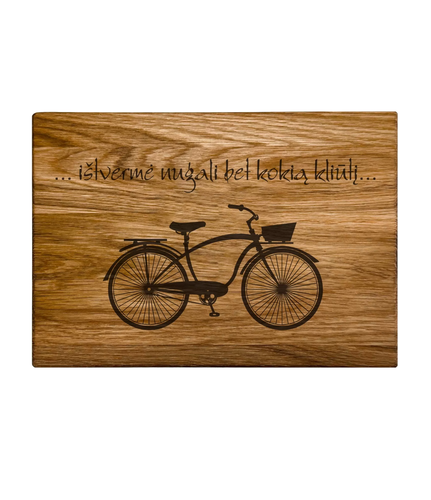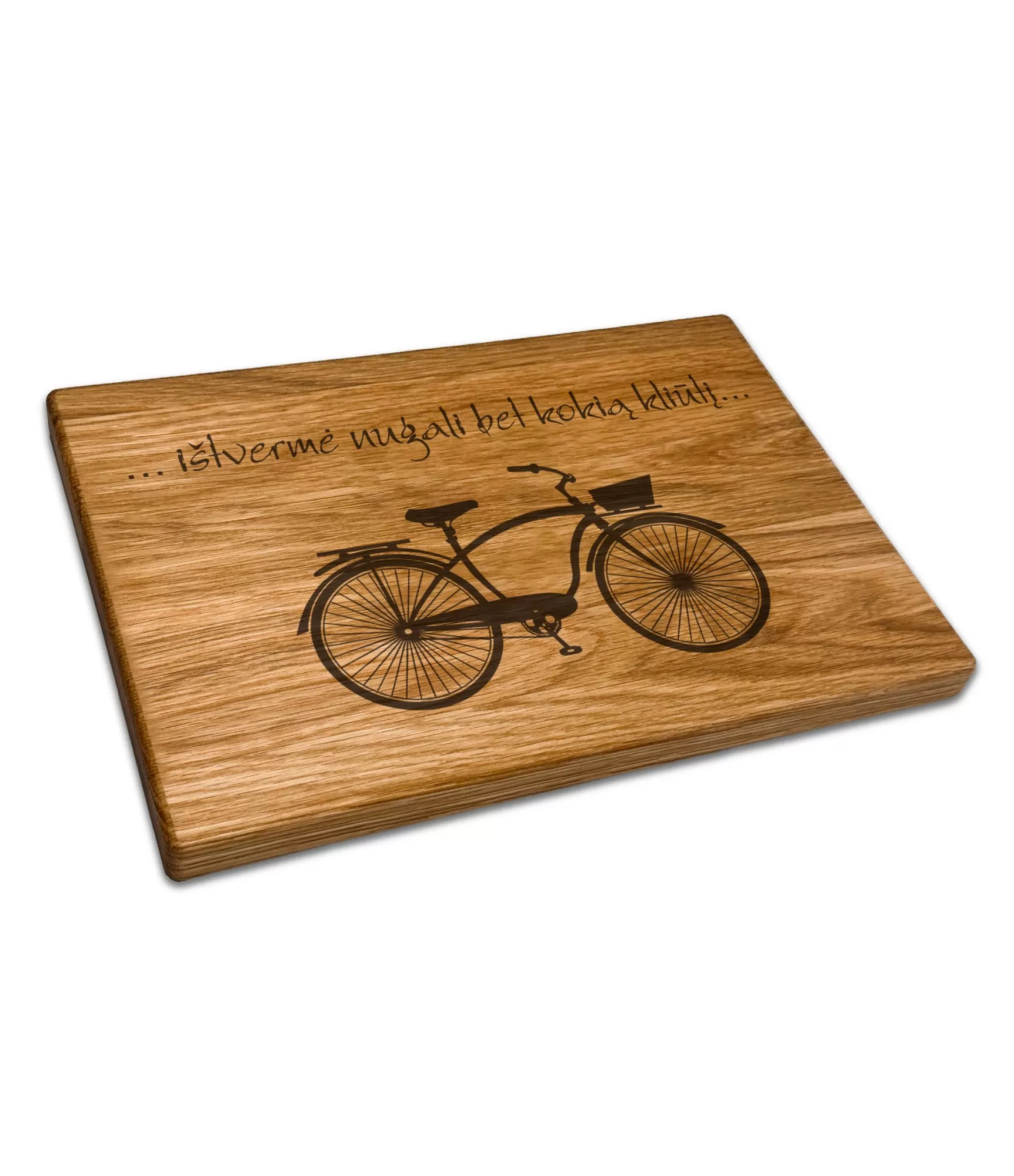 Originali pjaustymo lentelė "Dviratis su užrašu CB-2638-LT" su dviračio graviravimu ir įkvepiančiu užrašu "Ištvermė nugali bet kokią kliūtį" skirta tiems, kurie vertina judėjimą, tikslo siekimą ir aktyvų gyvenimo būdą. Tai ne tik praktiškas gaminys virtuvėje, bet ir kasdienė motyvacijos bei geros nuotaikos dozė. Dėl savo estetiškos išvaizdos ši lentelė puikiai tinka serviruoti sočius pusryčius ar energijos suteikiančius užkandžius, norint suteikti stalui išskirtinės nuotaikos.