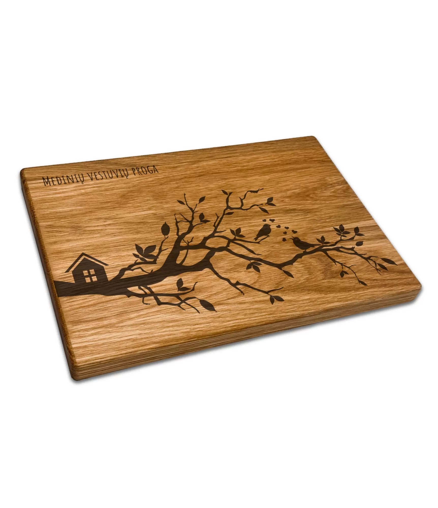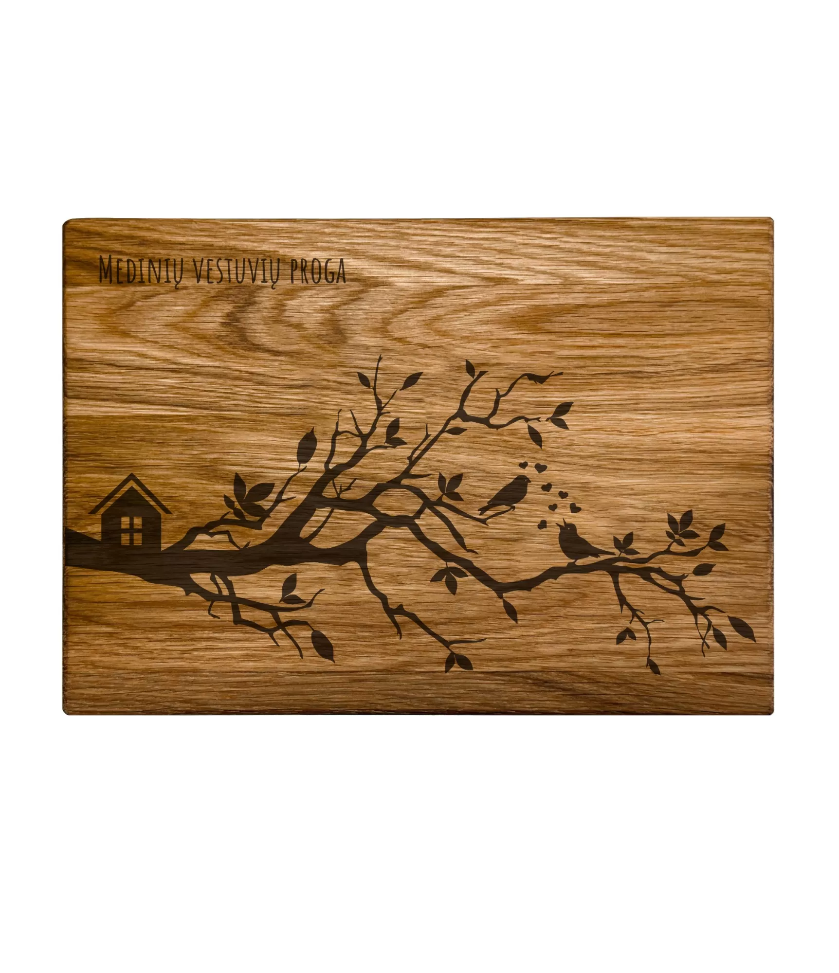 Stilingos pjaustymo lentelės „Medinių vestuvių proga CB-26P4-LT“ dizainas yra pritaikytas medinių vestuvių jubiliejui paminėti. Graviruotas medžio šakos motyvas su paukščiais ir jaukiu namelio siluetu simbolizuoja tvirtas šaknis bei kartu puoselėjamą užuovėją. Tai estetiškas pasirinkimas norint suteikti stalui išskirtinės nuotaikos, nes lentelė puikiai tinka tiek vaišėms serviruoti, tiek kaip dekoratyvus virtuvės elementas.