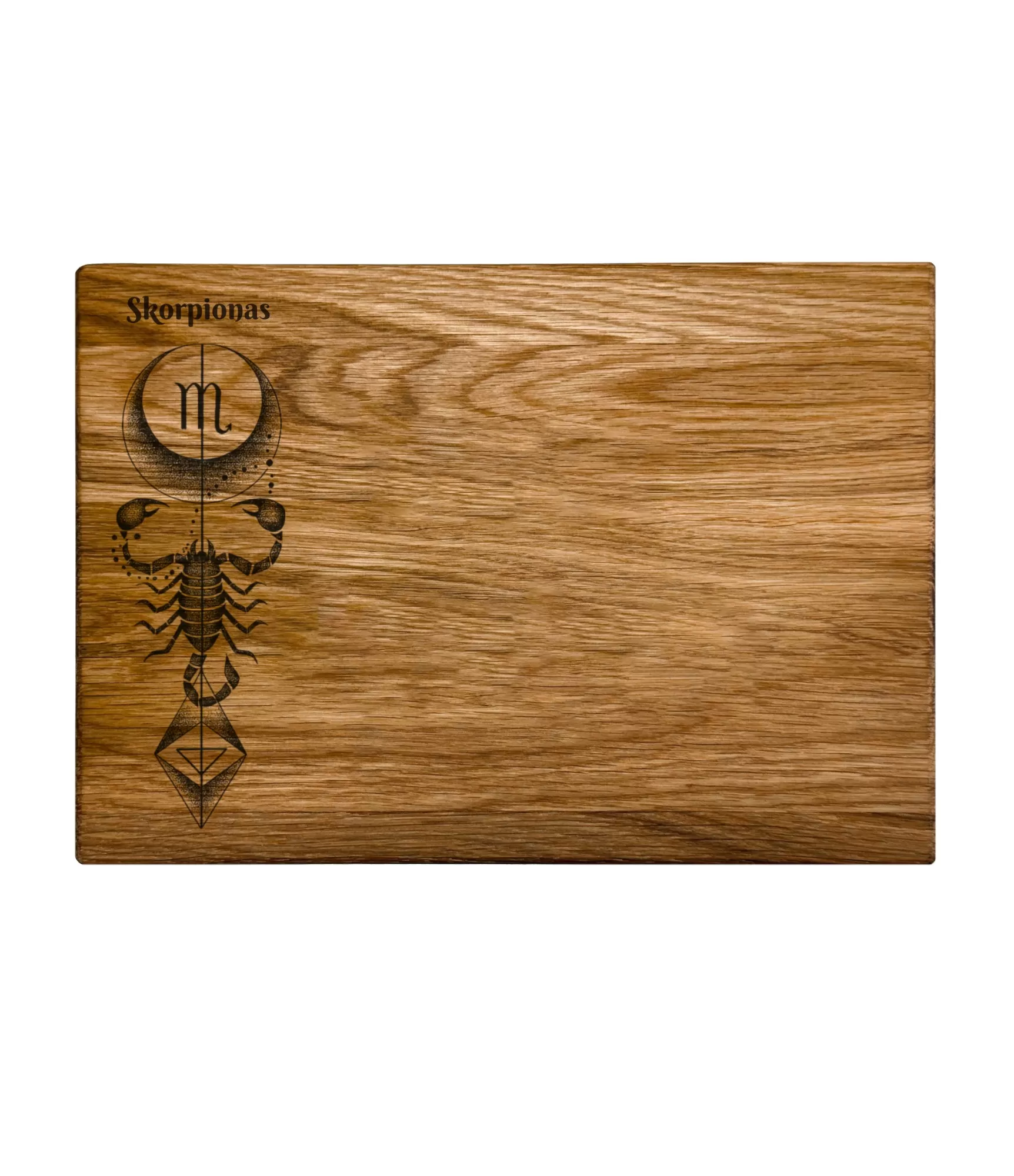 Toks ilgaamžis ąžuolo gaminys taps vertinga dovana, kurioje praktiškumas susijungia su gilia simbolika. Medis pasižymi ypatingu patvarumu, o kokybiška alyva saugo paviršių nuo drėgmės bei išryškina natūralią tekstūrą. Lentelė jau supakuota į stilingą dovanų dėžutę, todėl tai jau paruošta gimtadienio staigmena, įkurtuvių sveikinimas ar įsimintinas dėmesio ženklas stipriai asmenybei. Papildomai šalia zodiako ženklo galite išgraviruoti jūsų pasirinktą tekstą. Tai gali būti vardas, svarbi data ar tokios frazės kaip: "Indrė – Skorpionė", "Gimusi stipri", "11.12 – Skorpionas" arba "Mano šefė". Tokia asmeninė detalė paprastą daiktą paverčia emociškai brangiu atsiminimu.