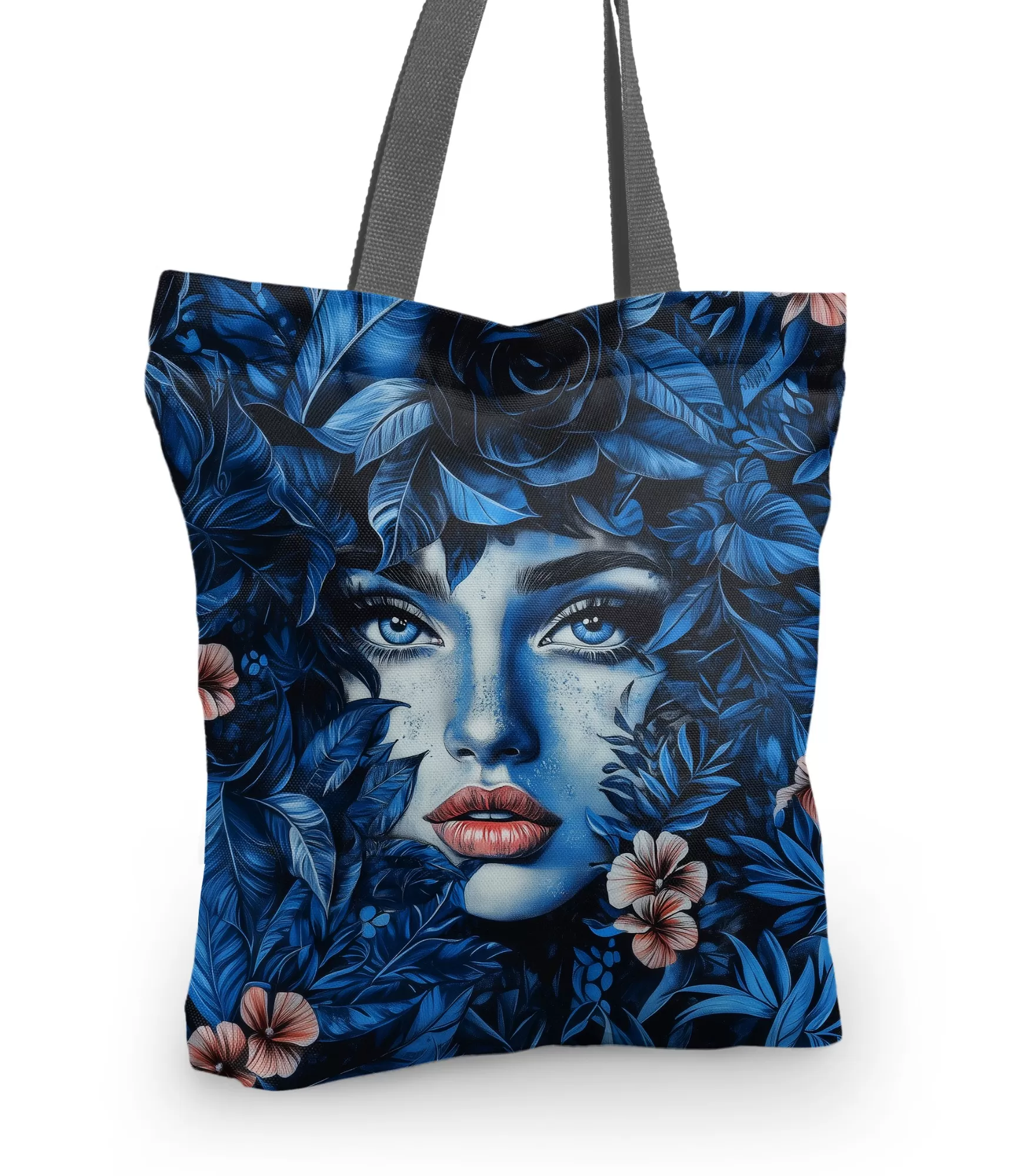 Ši rankinė traukia akį iš pirmo žvilgsnio – tamsiai mėlynas lapų fonas su paslaptingu moters veidu sukuria magišką, beveik siurrealistinį įspūdį. Į ją žiūrint, atrodo, tarsi moters akys žvelgtų tiesiai į sielą. Gilūs šešėliai, aiškiai išreikšti antakiai ir subtiliai paryškintos lūpos įkomponuotos į lapų sūkurį, kur kiekvienas augalas primena paveikslą, o visa rankinė – lyg galerijos eksponatas. Tarp mėlynų tonų išsiskiria švelnūs rožiniai žiedai – vos keli, bet būtent jie įveda šilumos natą, padeda atskleisti emocinį paveikslo gilumą. Spauda pasižymi ypatingu ryškumu, o medžiaga perteikia kiekvieną detalę – nuo šešėlio kontūrų iki žvilgsnio spindesio.