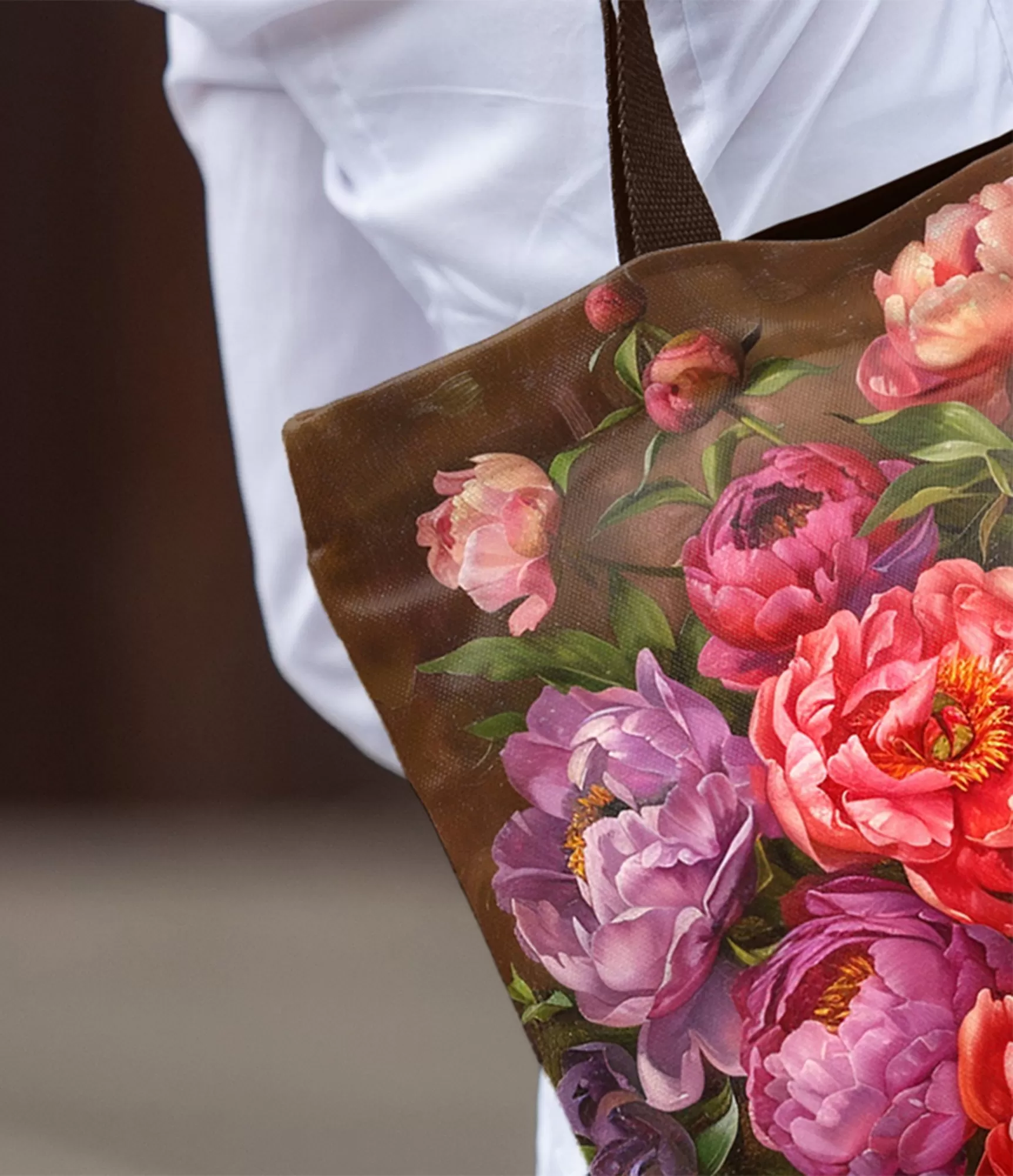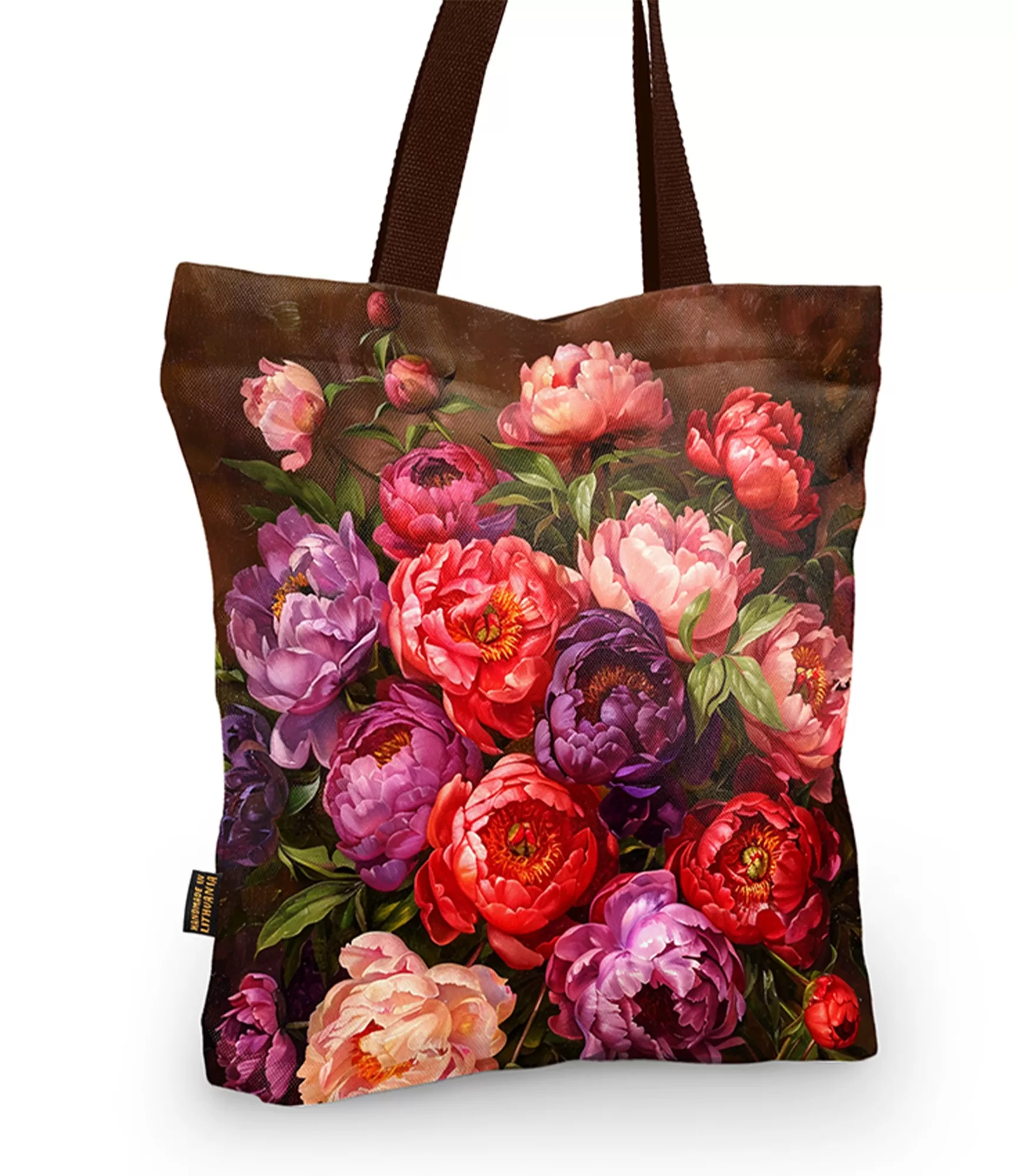 Kai vasaros rytas prasideda saulės spindulių paliestame sode, o orą pripildo bijūnų aromatas, norisi tą akimirką išsaugoti amžinai. Būtent šį jausmą įkūnija ši moteriška rankinė, kurios dizainas pulsuoja gėlėmis ir sodriomis spalvomis. Rankinėje pavaizduotas gausus bijūnų žiedynas – nuo šviesiai persikinių iki sodriai violetinių, nuo gilių bordo iki spindinčiai raudonų – tarsi sprogsta emocijomis, kviesdamas į gėlių šventę. Fonas parinktas subtiliai rudai – jis sustiprina gėlių ryškumą ir sukuria šilumos pojūtį. Tai ne tik aksesuaras, bet ir meno kūrinys, pasakojantis istoriją apie stiprią moterį, jos vidinį grožį ir gebėjimą žydėti bet kokiomis aplinkybėmis.