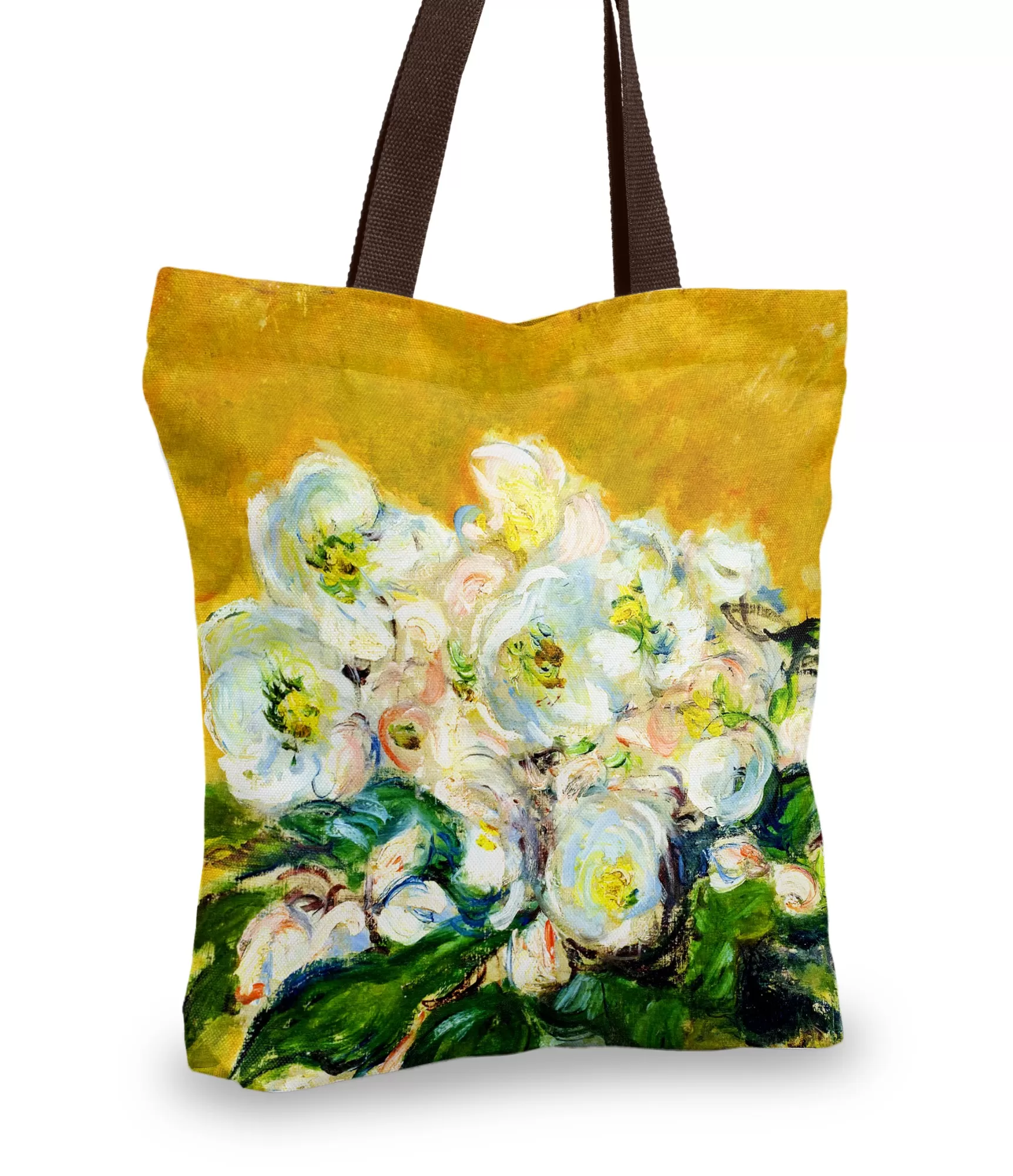 Rankinė moteriai, kuri spindi tyliai. Šis Claude Monet įkvėptas aksesuaras primena ankstyvą rytą, kai saulė dar tik pradeda glostyti langų kraštus, o ant stalo stovi rožių puokštė – gyva, neperkrauta, pilna vidinio švytėjimo. Priekinėje pusėje žydi švelnūs, lyg iš sniego nulipdyti rožių žiedai – balti su vos įžiūrimu gelsvu centru, lengvai apibrėžti ekspresyviais potėpiais. Jie susilieja su sodriai žaliais lapais, o viską gaubia aksominis fonas – sodriai garstyčių geltonumo, suteikiantis šilumos, bet ne triukšmo.