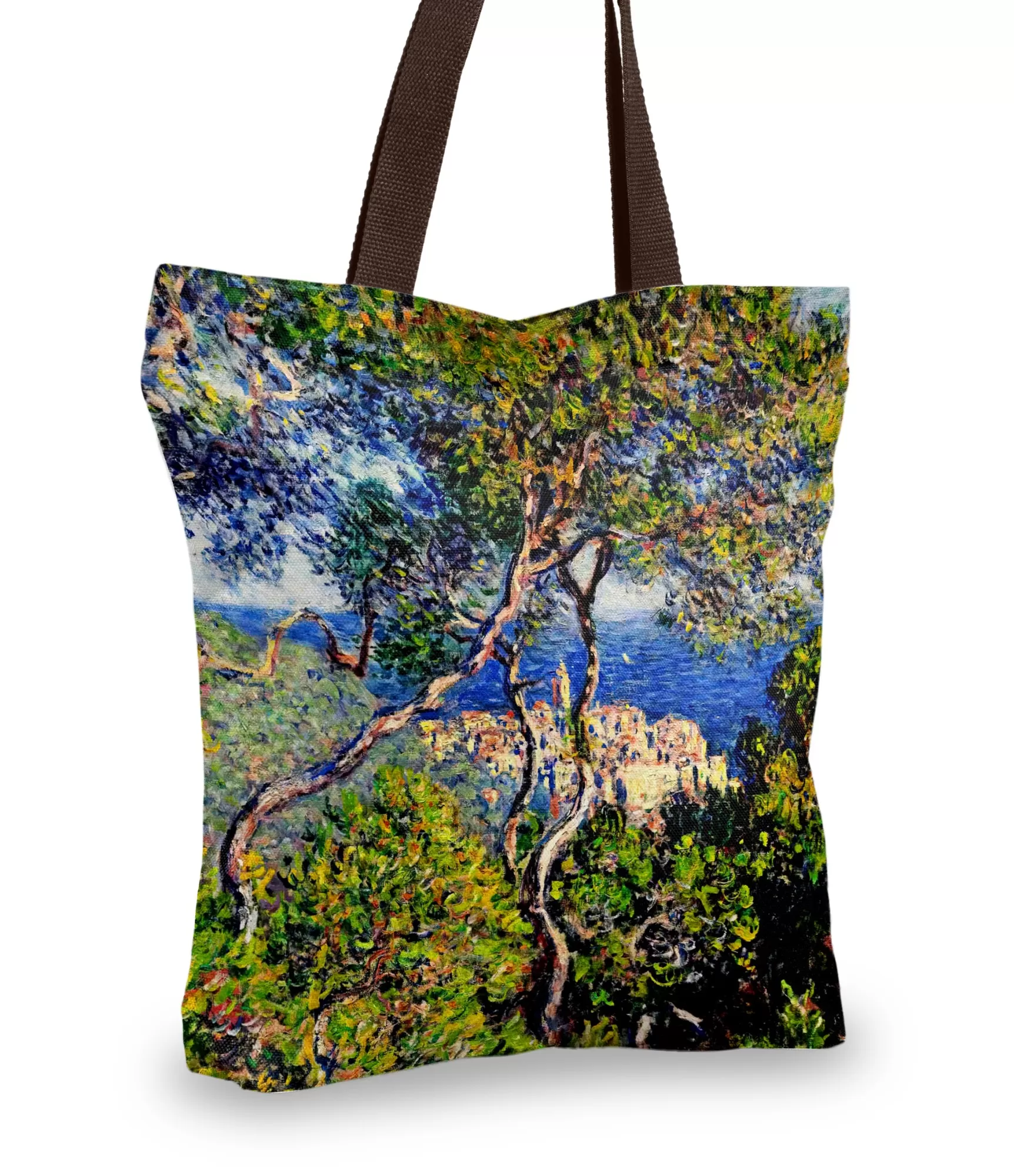 Dizainas alsuoja impresionizmo dvasia – sodrūs žalumos potėpiai, gilūs mėlyni šešėliai ir saulės nutvieksti miestelio stogai perteikia natūralios gamtos judesį. Dvi ekspresyvios medžių šakos tarsi įrėmina visą sceną – jos apgaubia Bordigheros miestelį, esantį tolumoje, prie pat jūros. Tai ne statiškas paveikslas, o gyvas reginys – tarsi žvilgsnis pro langą vasaros rytą. Tamsiai rudos rankinės rankenos subtiliai išryškina spalvų sodrumą, o spaudos paviršius perteikia tapybinį potėpį itin tiksliai.