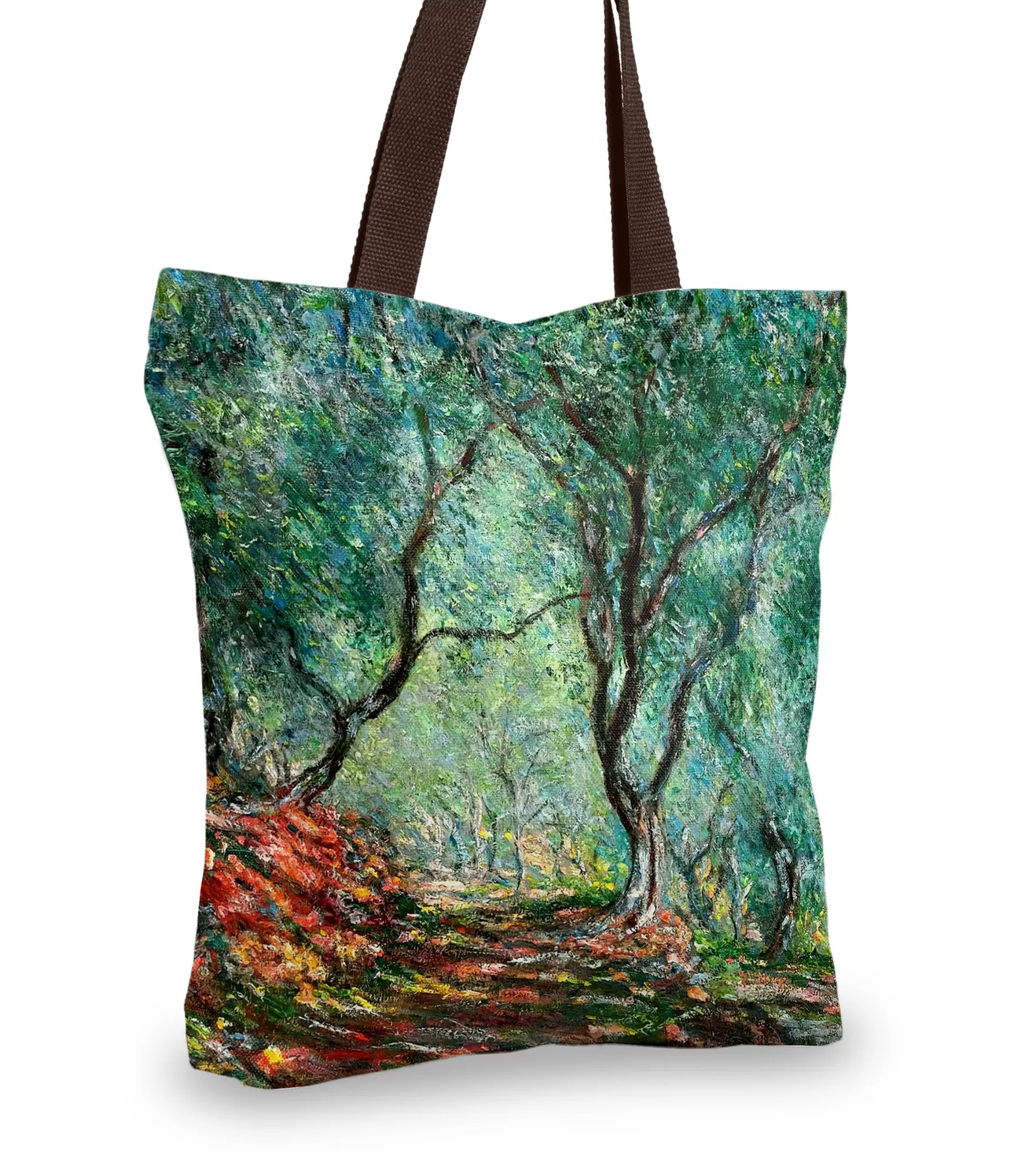 Pasivaikščiojimas šviesos takais, kur alyvmedžių kamienai išlenkti kaip senovės istorijos, įamžinti Claude Monet drobėje, virsta ne paveikslu, o kasdieniu palydovu – rankine, alsuojančia ramybe ir viduržemio miško tyla. Žalsvai melsva tonacija, susimaišiusi su saulės atplaišomis, nuteikia svajingai. Tarsi laikytum mažą paveikslo fragmentą tarp delnų – tokį, kurį gali neštis su savimi, be rėmų, be sienų, su įkvėpimu ir paprastumu. Monet šepetėlio potėpiai čia ne statiški – jie juda kartu su tavimi, įsilieja į tavo kasdienybę.