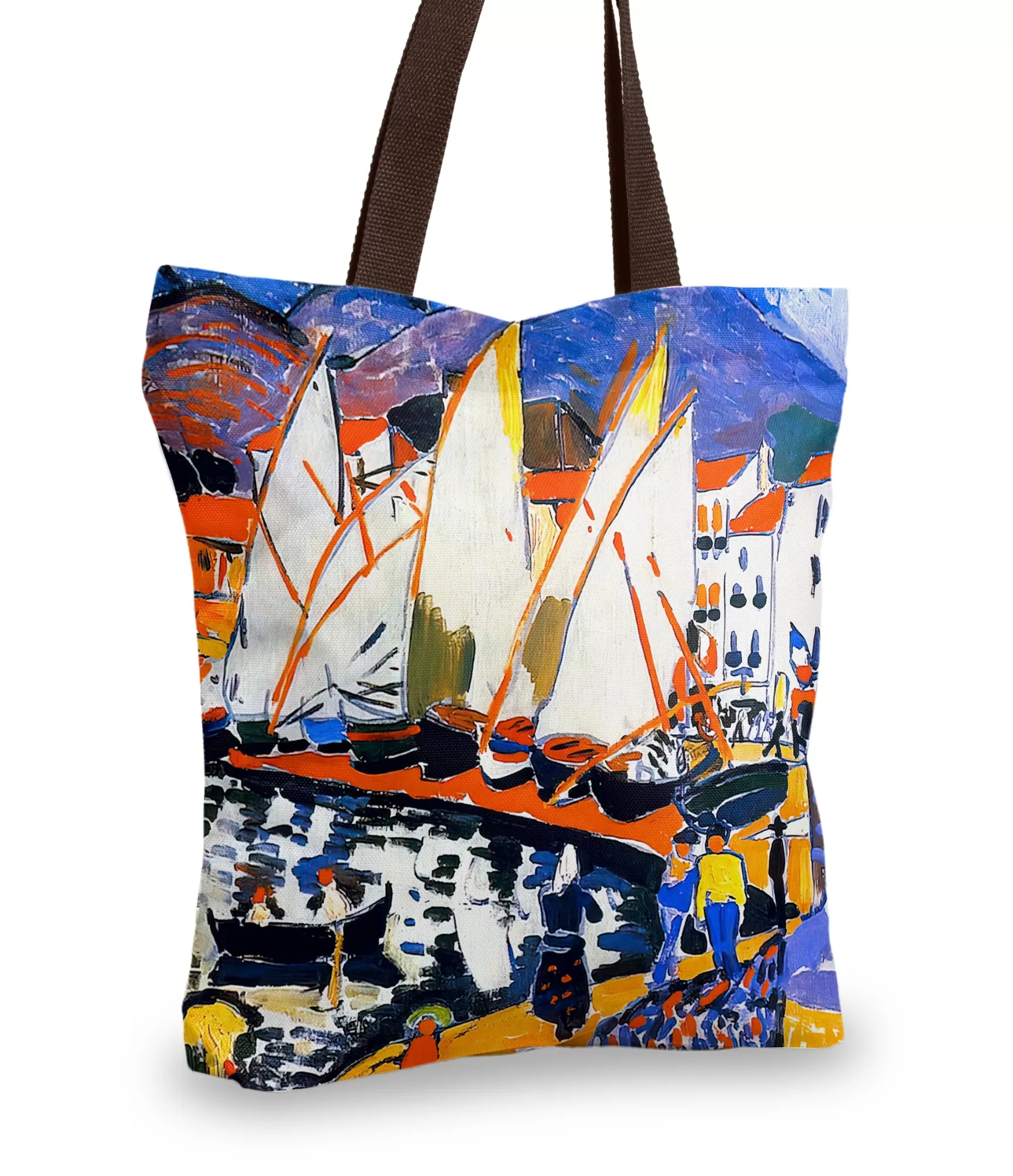Ši rankinė – tikra spalvų sprogimo kulminacija, įkvėpta André Derain kūrinio „Drying the Sails“. Čia kiekvienas potėpis tampa drąsa, kiekviena spalva – energija, o visas paveikslas – tarsi gyvenimo šventė, kurią galima nešiotis su savimi. Ryškiai baltos burės, kontrastuojančios su oranžinėmis virvėmis ir degančia geltona pakrante, išskleidžia ne tik burlaivius, bet ir emocijas. Fonas alsuoja violetiniais kalnų atspindžiais, lyg švelniai prigesintais Derain paletės aidais, o miestas – spalvų architektūra, kur kiekvienas pastatas šoka savo ritmu. Visa tai užfiksuota ant kokybiško audinio, kuris šią kompoziciją paverčia gyvu aksesuaru, drąsiu stiliaus pareiškimu.