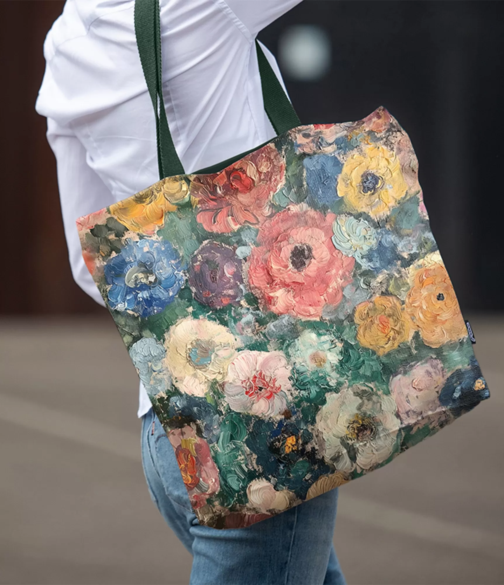 Stilinga rankinė - krepšys moterims dekoruotas C. Monet įkvėptais gėlių žiedais.