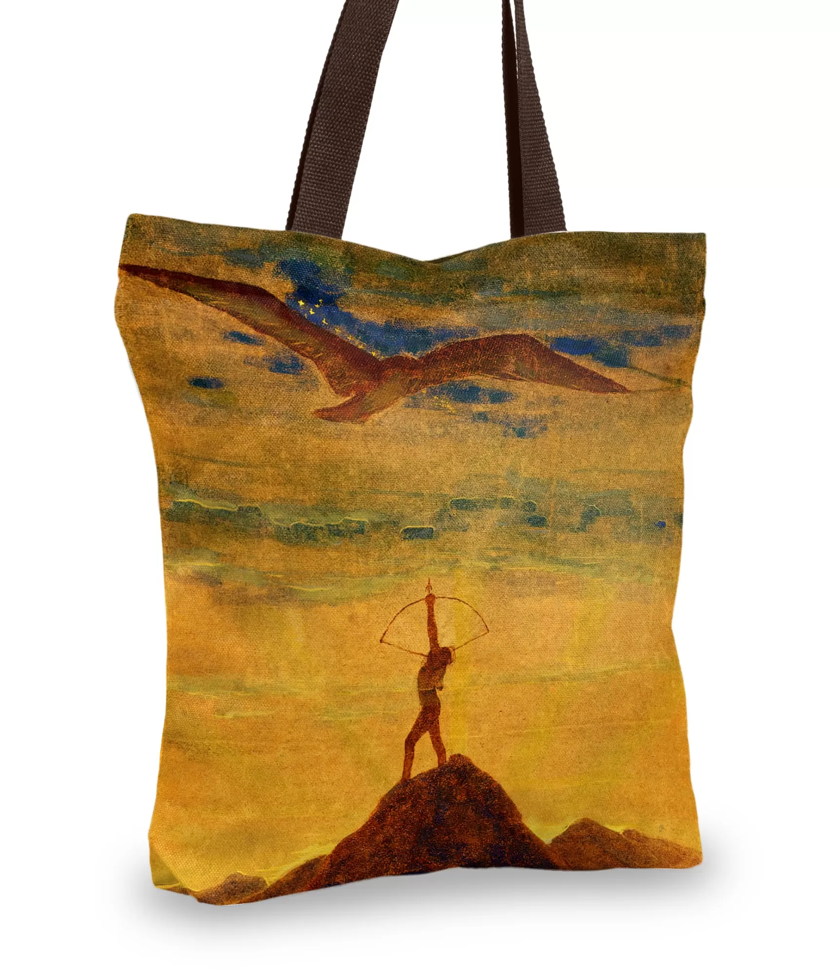 Kai dangus tampa scena, o žvaigždės — aktoriais, įžengia Saulė, keliaujanti per Šaulio ženklą. Šis M. K. Čiurlionio paveikslu dekoruotas rankinės dizainas neša ne tik zodiako simboliką, bet ir gilų estetinį išgyvenimą. Ant šios moteriškos rankinės matome vienišą kalną, į kurį įsmeigta auksinė strėlė, o aukštai virš jo — raudonai žėrinti saulė, tarsi vedlė. Virš visko sklando sapniški debesys, kurie ne tik užpildo dangų, bet ir suteikia visai scenai paslaptingą ir neribotos laisvės pojūtį. Tai ne dekoras — tai žvilgsnis į pasaulį, kuriame intuicija ir vaizduotė yra vertybės.