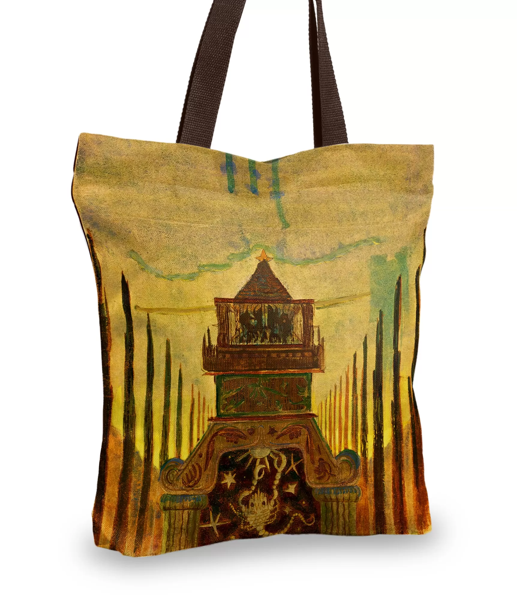 Rankinės, įkvėptos M. K. Čiurlionio zodiako ciklo, išsiskiria ne vien savo funkcionalumu, bet ir dvasiniu gilumu. „Saulė eina Skorpiono ženklu“ kompozicija perteikta ant audinio neprarandant nė kruopelytės autentiškumo: rudai auksiniai tonai šildo tarsi žvakės liepsna, o centrinė architektūrinė figūra kviečia pasinerti į apmąstymus. Šioje rankinėje įamžintas paveikslas neša gilią simboliką – kaip ir pats Skorpionas, ji kalba apie transformaciją, slėpinį ir jėgą, gimstančią iš tylos.
