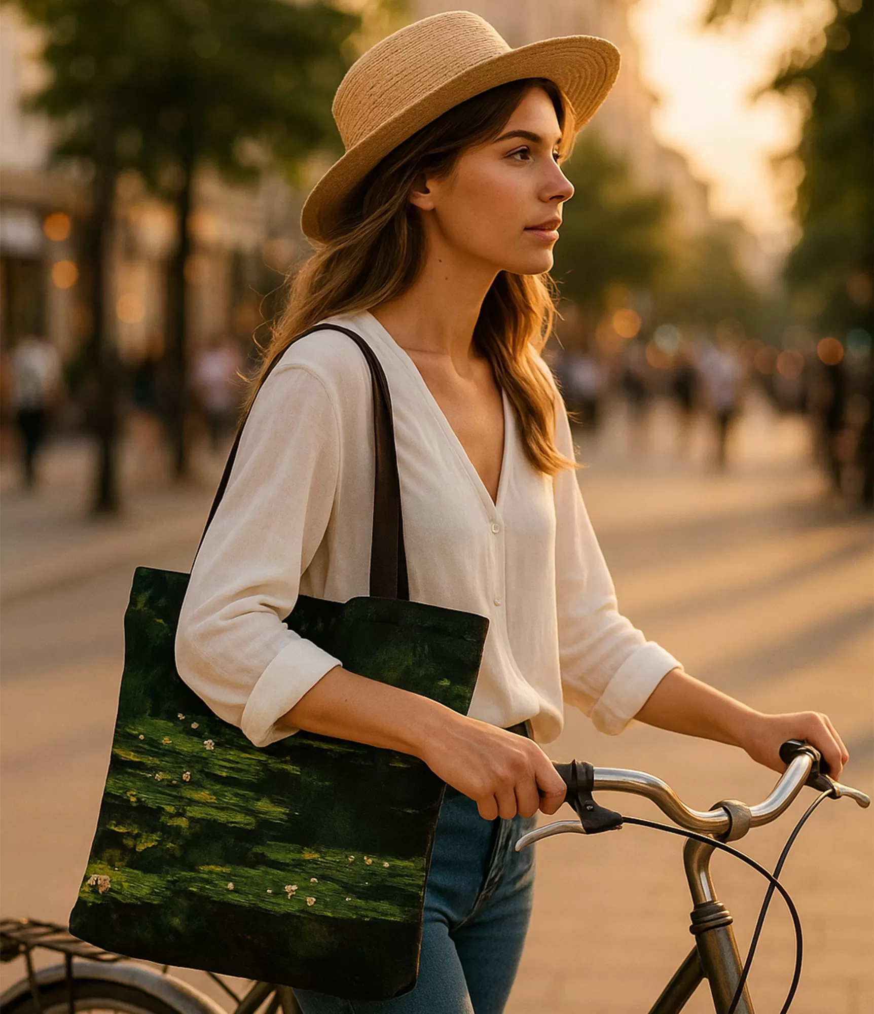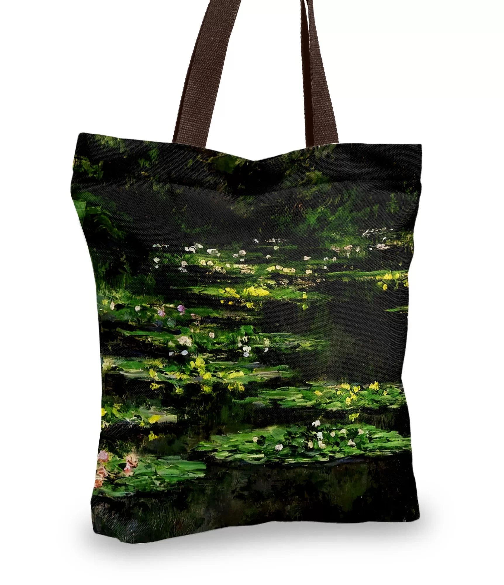 Ši moteriška rankinė alsuoja tyla. Ne vakaro, o gilios vidinės tylos, kurioje telpa ir šviesa, ir tamsa. Claude Monet „Water Lilies“ serijos interpretacija šįkart pasirenka tamsesnę gamtos pusę – žalių tonų gausą, gilų šešėlį, ir tik vietomis blyksinčias baltas bei rausvas vandens lelijas. Priekinėje pusėje žvilgsnį pasitinka ežero paviršius, apkibęs lapais ir žiedais – jis lyg užmerktos akys, ilsinčios mintį. Potėpiai – tiršti, sluoksniuoti, giliai susigulėję. Visa kompozicija alsuoja ne teatrališkumu, o susikaupimu.