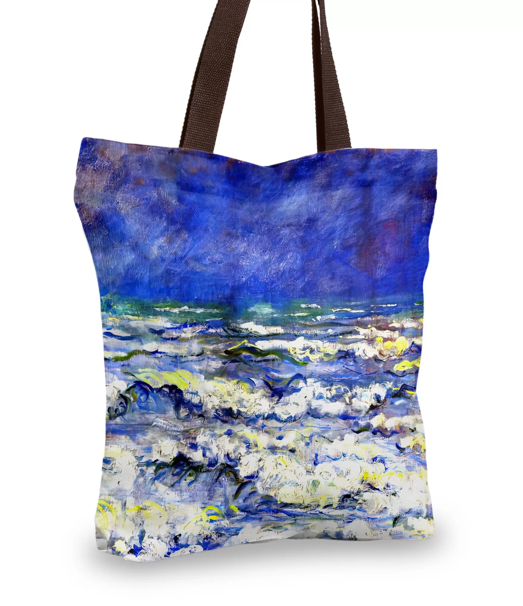 Paviršius švyti mėlynais sūkuriais, tarsi ši rankinė būtų atplaukusi tiesiai iš audringo vandenyno, kur spalvos juda ne nuspėjama tvarka, o laisve. Claude Monet „Open Sea, Stormy Weather“ paveikslo motyvai čia suskamba tarsi gyvas kvėpavimas – bangų šėlsmas, dangaus gylis, spalvų sūkurys, į kurį norisi panirti. Vienoje rankinės pusėje dominuoja išplautų mėlynų, balto ir gelsvo potėpių ritmas, tarsi drobė būtų paversta vandens paviršiumi.