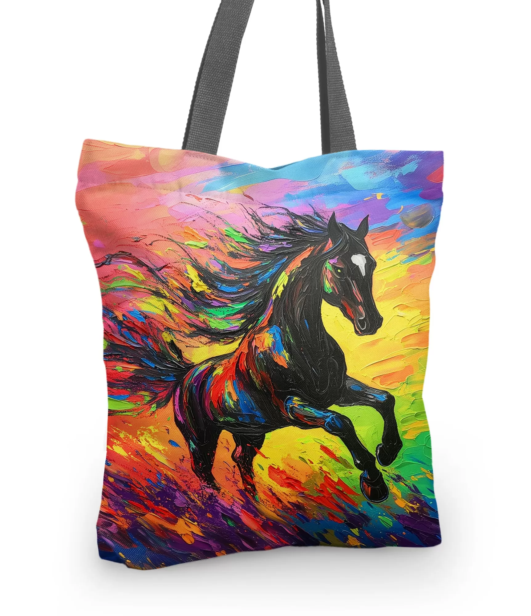 Ši rankinė – tai meno kūrinys, kur spalvos liejasi kaip ugnis ir vėjas. Fone sūkuriuoja raudona, rožinė, oranžinė, geltona, žalia, mėlyna ir violetinė – visos jos lyg emocijos, kurias pajunta žmogus, paleidęs save į tikrąjį bėgimą. Juodasis žirgas tampa kontrasto ašimi – lyg pačios laisvės metafora, kuri niekada nesileidžia prijaukinama. Jo karčiai plazda kaip liepsnos, o žvilgsnyje – veržlumas ir nepriklausomybė. Spalvos ne tik nudažo, bet ir įgarsina šį vaizdą: jis kalba apie drąsą, energiją ir vidinę jėgą.