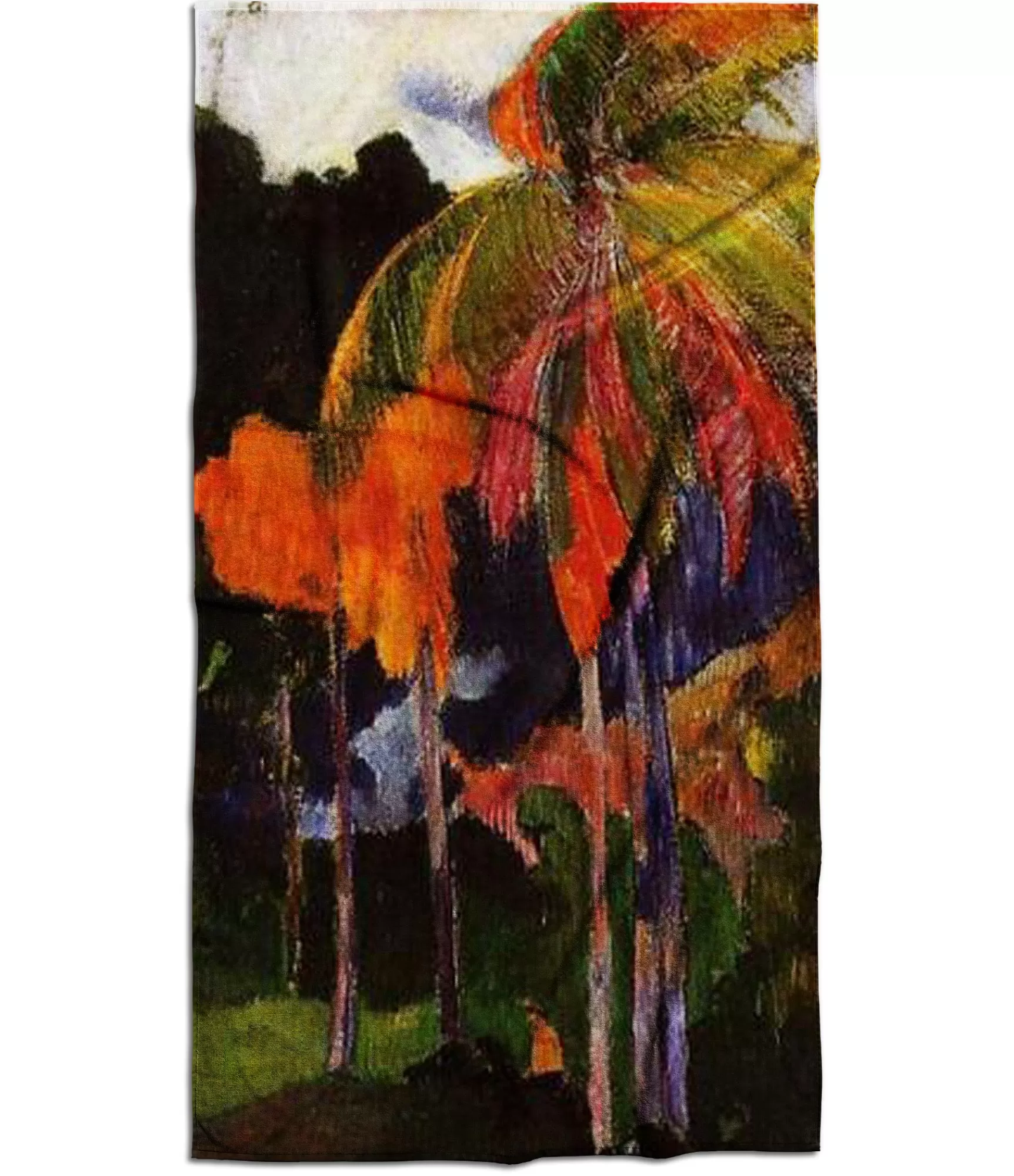 Šis rankšluostis – tai Paul Gauguin paveikslo „The Moment of Truth I“ interpretacija tekstilėje, kviečianti ne tik išsitiesti po saule, bet ir pajusti meną savo oda. Jame susipina sodriai žalia tropinės žolės apačia, grakščios violetinės palmės, liepsnojančios oranžinės ir raudonos spalvos, kurios pereina į intensyvią rožinę ir karštą geltonį. Visa tai sustiprina tamsiai mėlyni šešėliai ir juodi miško kontūrai, sukuria gilų kontrastą ir kviečia į paslaptingą atogrąžų pasaulį. Spalvos šioje kompozicijoje ne tik dailininko teptuko gestas, bet ir emocinė ekspresija – lyg atostogų prisiminimai, kuriuos norisi išsaugoti dar ilgai.