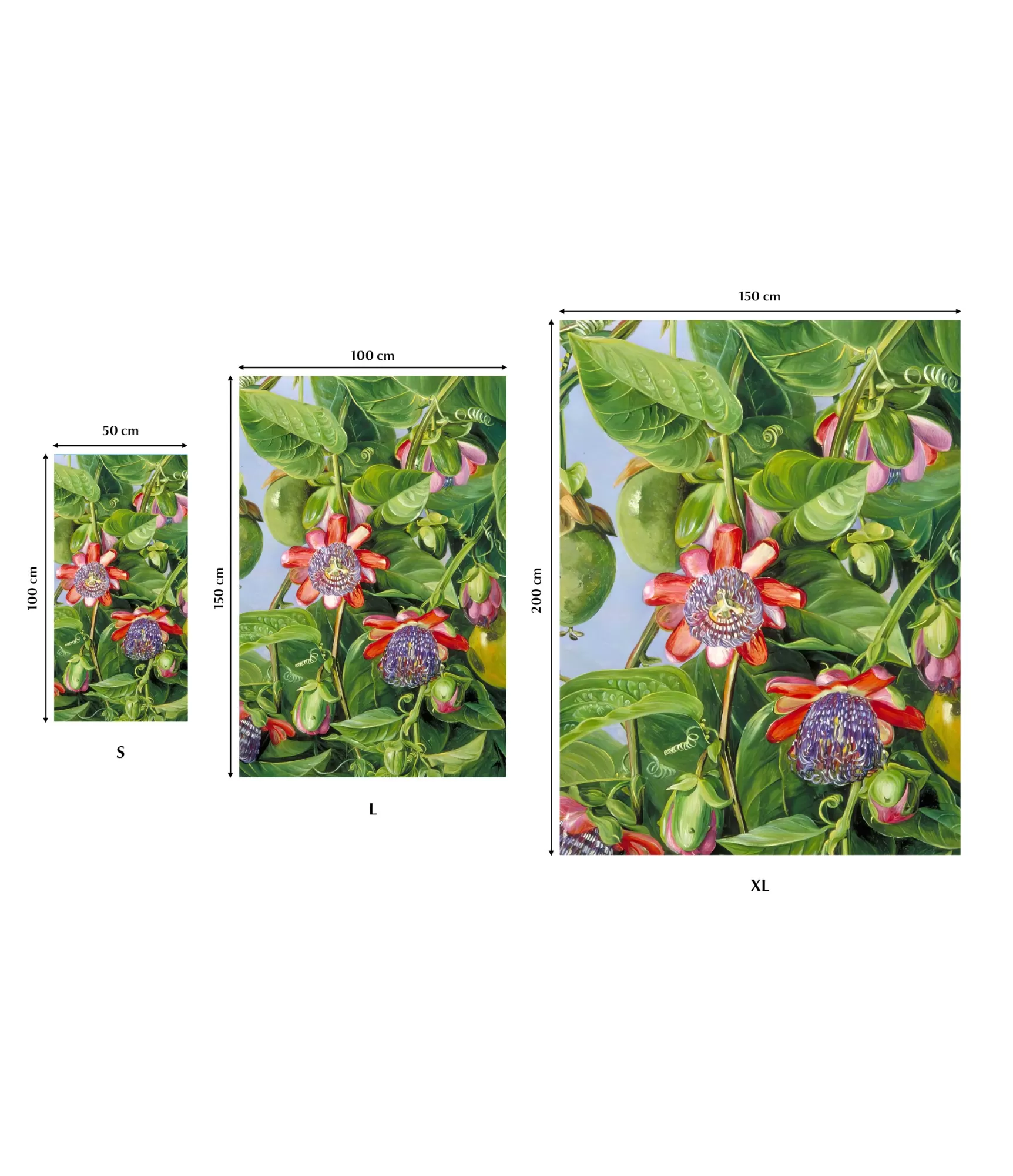 Šis rankšluostis dekoruotas vienu iš įspūdingiausių Marianne North botanikos darbų – spalvingais, egzotiškais pasiflorų žiedais. Centrinėje kompozicijoje dominuoja dvi stambios gėlės su purpuriniu viduriu ir ryškiais raudonais žiedlapiais, apsuptos sodriai žalių lapų, vijoklinių stiebų ir pumpurų. Detalumas stulbinantis – kiekvienas lapo vingis, žiedo tekstūra ir spalvų sluoksnis perteiktas su aiškumu ir gyvumu.