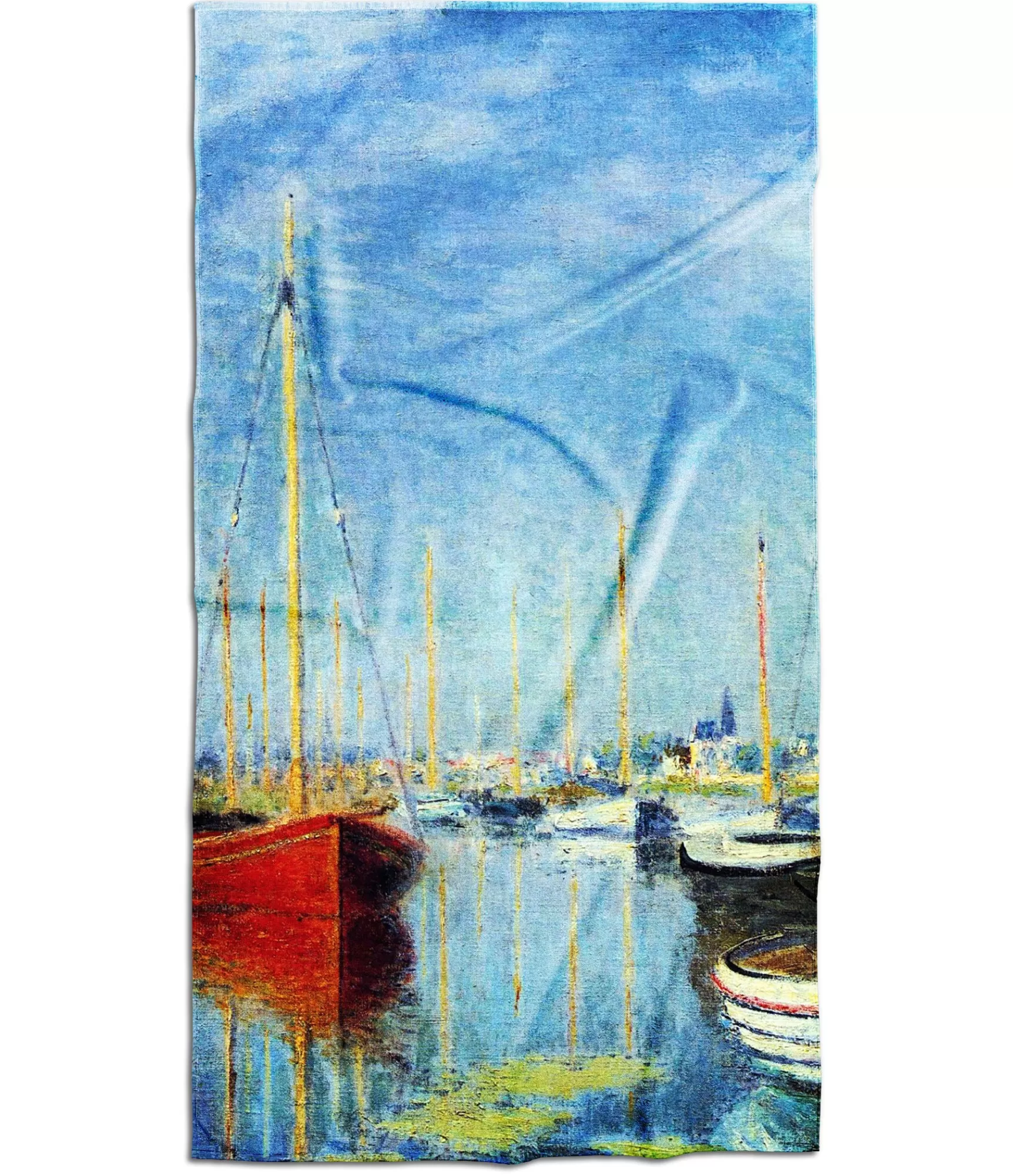 Rankšluosčiai su Claude Monet tapyba virsta kvietimu į impresionizmo pasaulį – šįkart su žvilgsniu į uostą Argenteuil miestelyje, kur vasaros ramybė tarsi įstrigo amžinybėje. Ant šio rankšluosčio atspaustas Monet paveikslas „Yachts at Argenteuil“ įtraukia akimis: mėlynas dangus ir vanduo susilieja į vieną toną, žvilgantis raudonas laivas dešinėje balansuoja su baltų jachtų burėmis kairėje. Dangus nebesibaigia viršuje – jis tęsiasi vandenyje, kur atsispindi kiekvienas stiebas, kiekviena horizontali linija. Tai įkvėpimo vertas peizažas, o dabar – ir praktiškas, ryškus, išskirtinis aksesuaras.