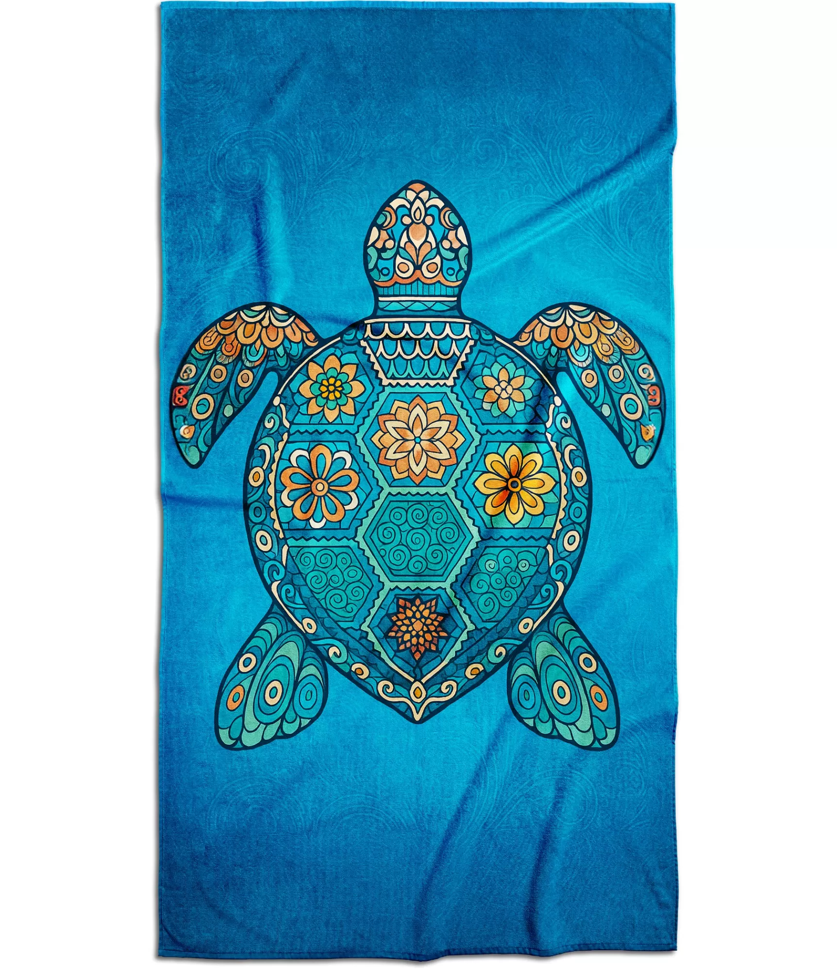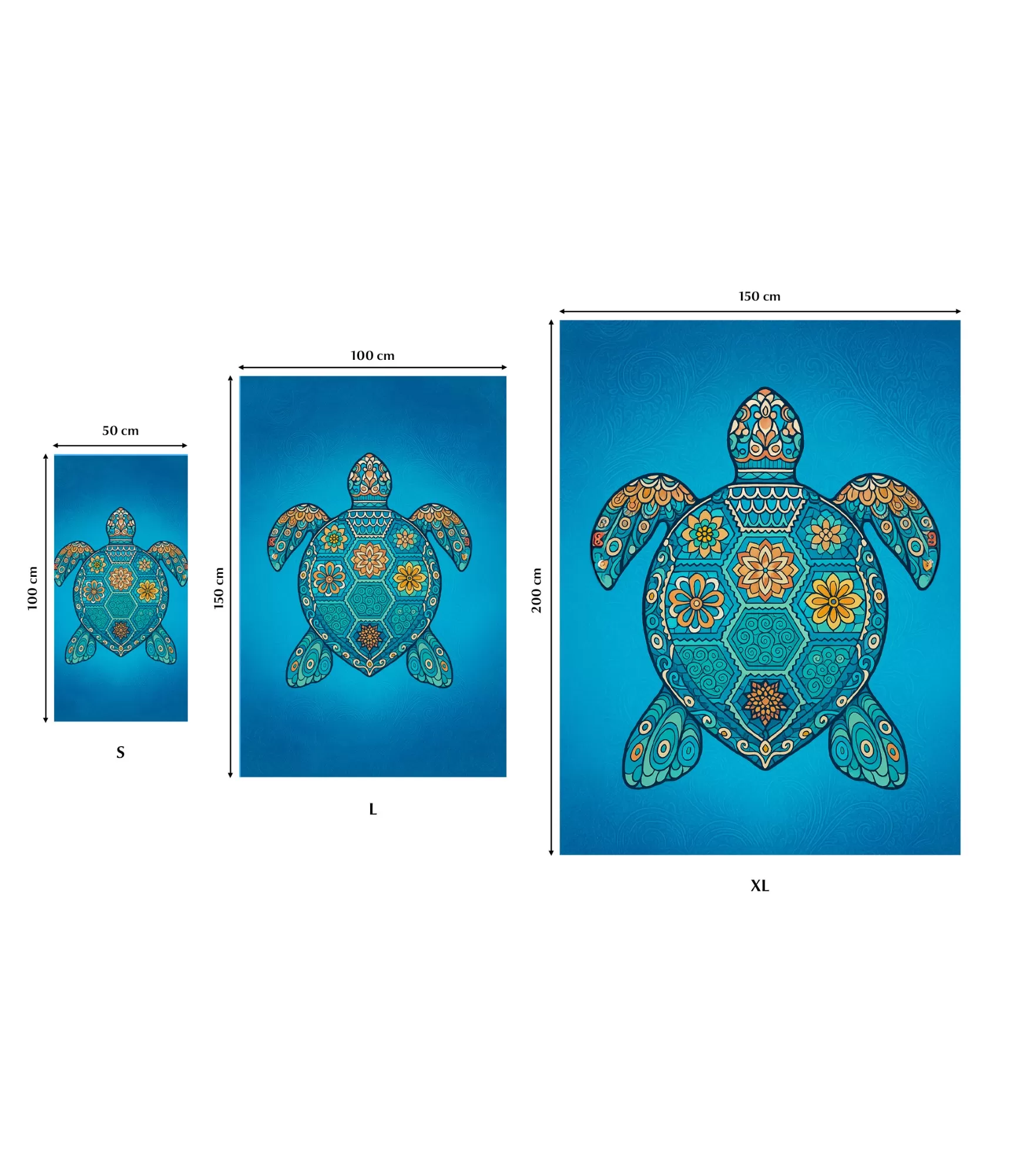 Kai ryto šviesa krinta ant drėgnų vonios plytelių, o oras dar prisodrintas karšto dušo garų, norisi apsigaubti šiluma, kuri ne tik džiovina kūną, bet ir gydo sielą. Būtent toks jausmas apgaubia įsisupus į šį ryškų, išskirtinį vonios rankšluostį su vėžlio motyvu. Čia, ant sodriai mėlynos fono, išryškėja stilingai stilizuotas jūros vėžlys – jo kiautas dekoruotas tarsi mozaikinis mandalų piešinys, kuriame oranžinės, geltonos ir mėtinės spalvos žydi lyg tropinės gėlės, o kiekvienas šešiakampis formuoja tobulą dermę.