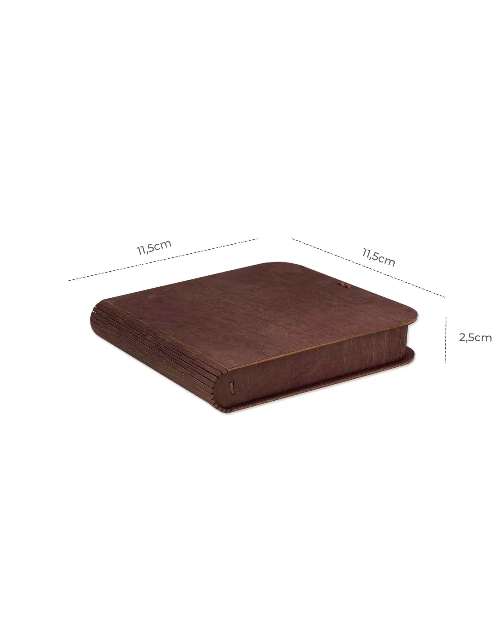 Medinės dėžutės išmatavimai: 11,5 x 11,5 x 2,5 cm.