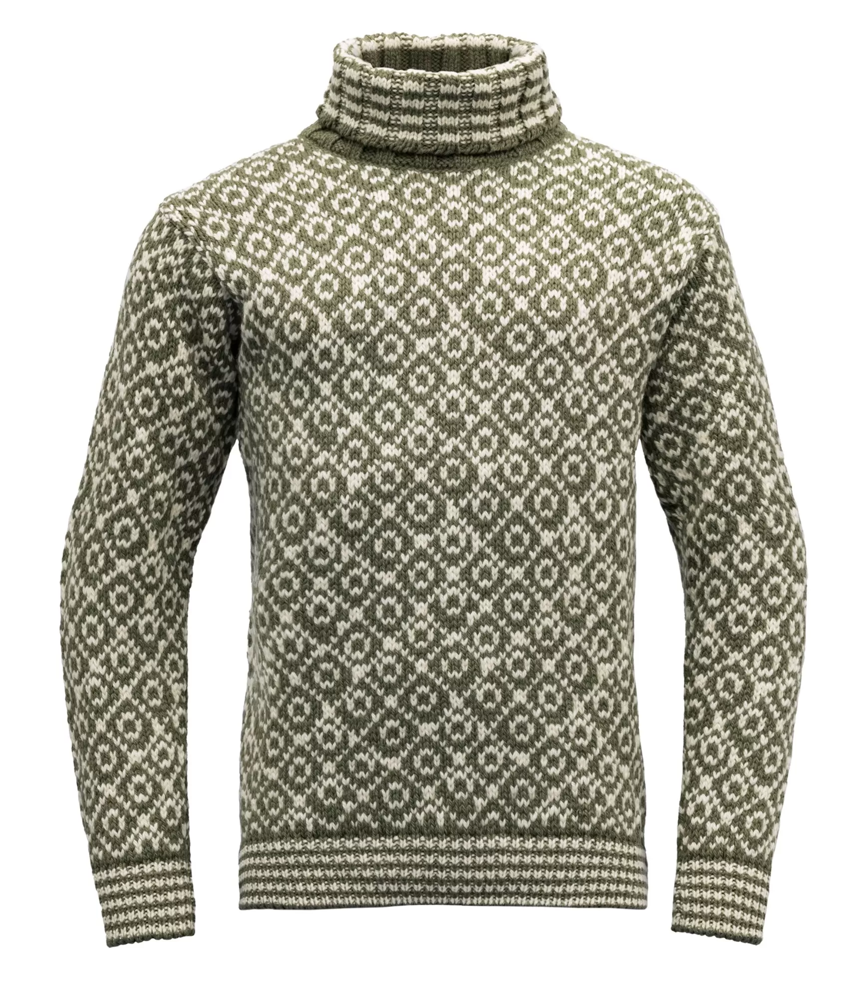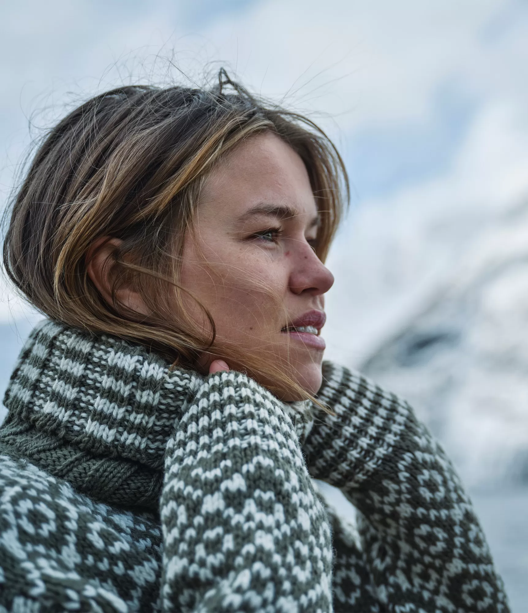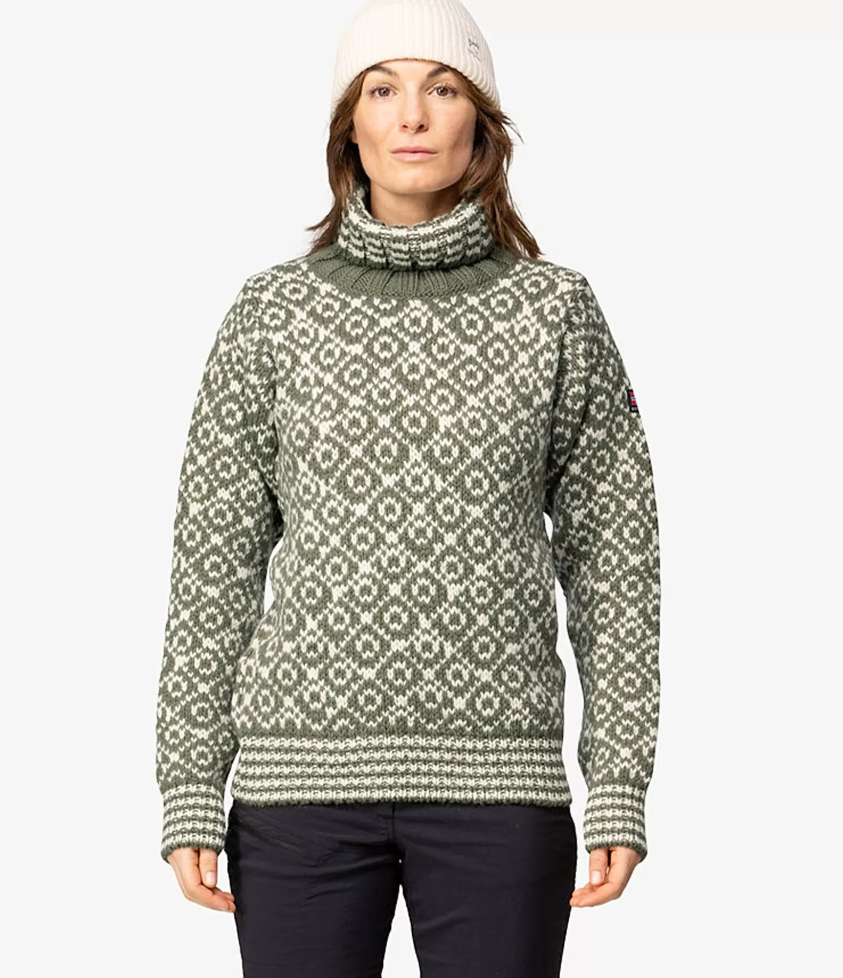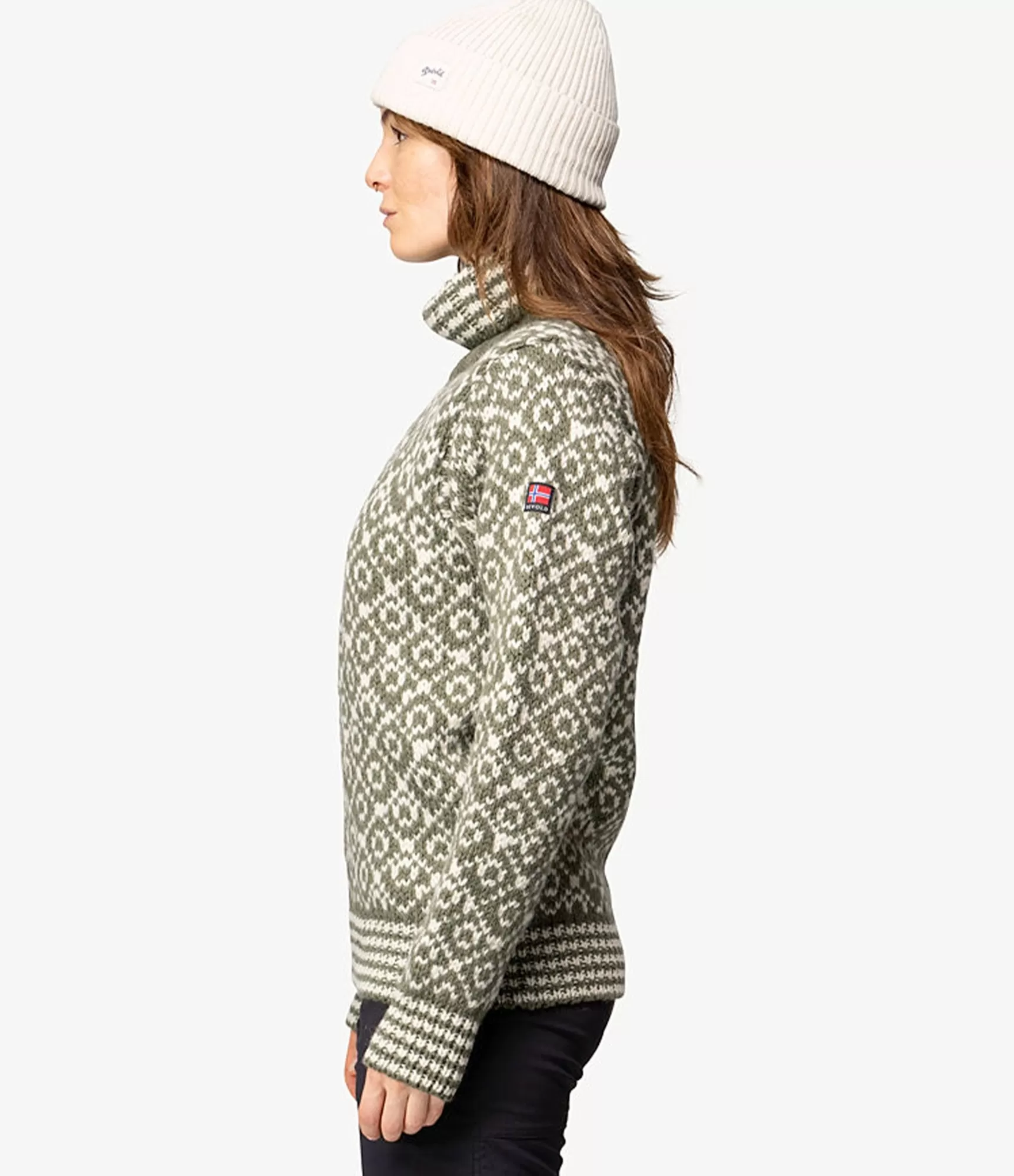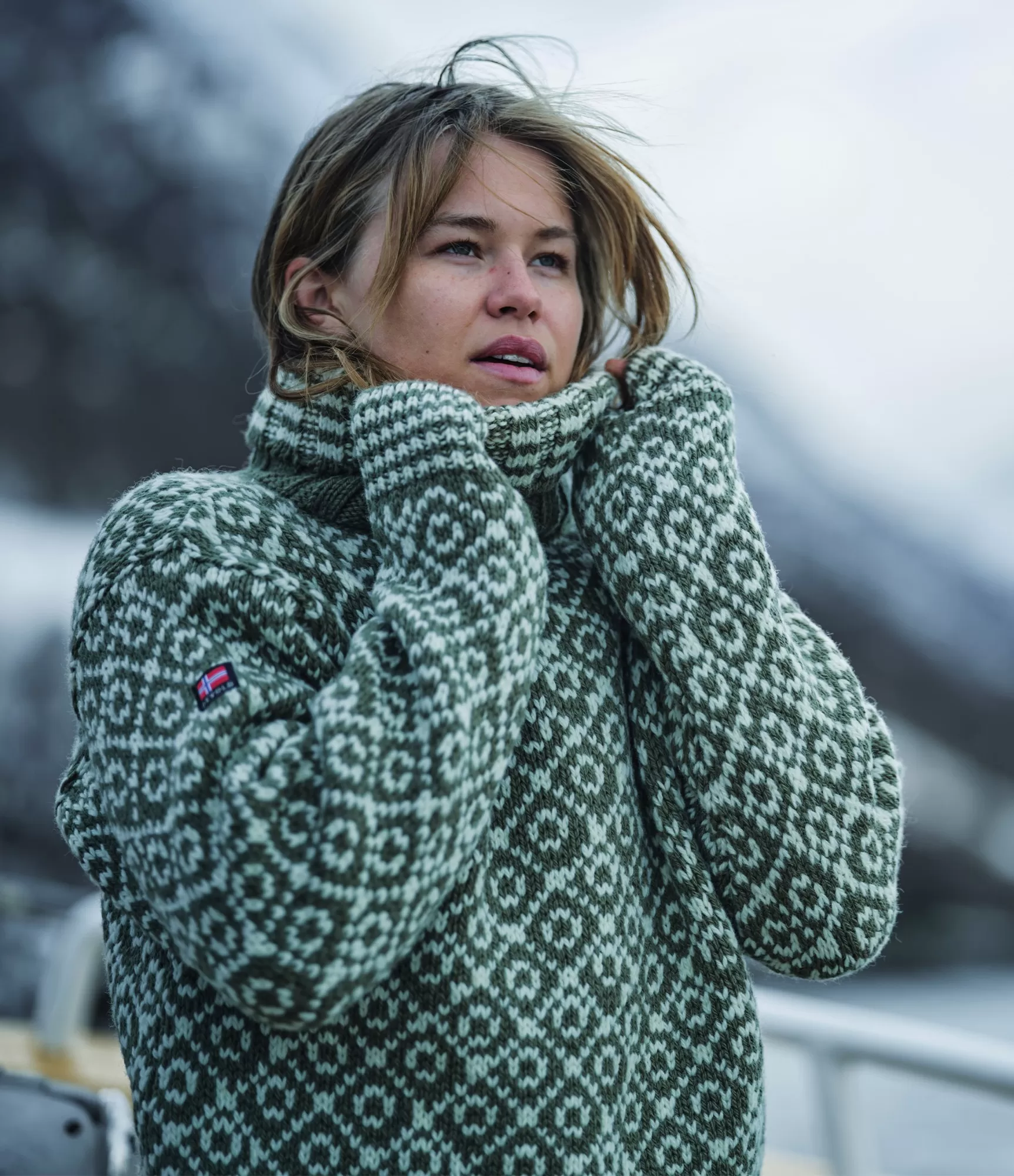 Alyvuogių žalia („Olive“) ir balta („Offwhite“) spalvų kombinacija suteikia megztiniui natūralią, žemišką išvaizdą, kuri dera prie bet kokio stiliaus. Klasikinis skandinaviškas raštas pabrėžia tradiciją, o aukštas kaklas saugo nuo vėjo, todėl nereikia papildomo šaliko.
