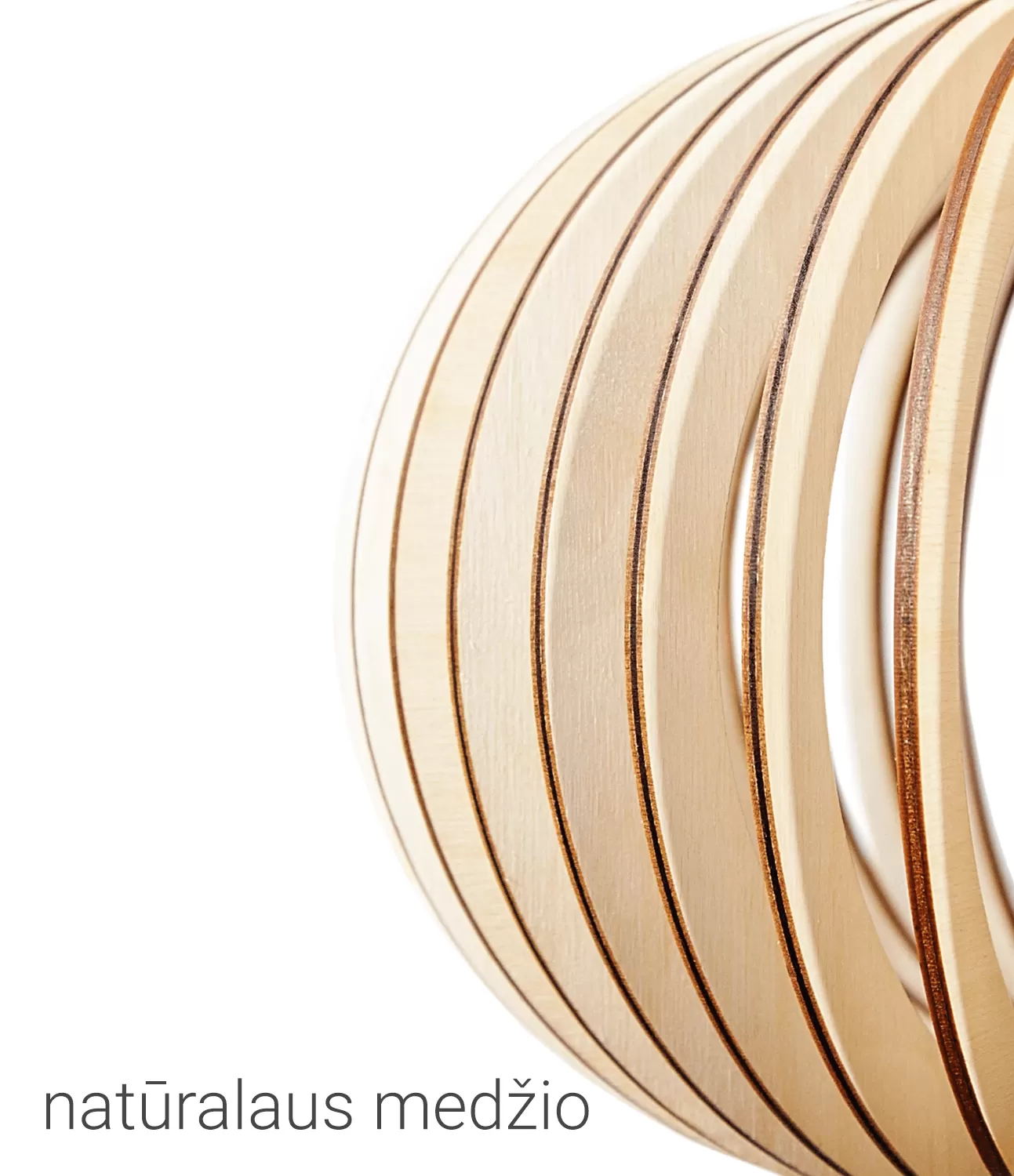 Per medinių juostelių tarpus jaukiai krenta šviesa, tad šis medinis pakabinamas šviestuvas stilingai atrodo pakabintas virš valgomojo stalo virtuvėje, jaukiai atrodo miegamajame, vaiko ar darbo kambaryje.