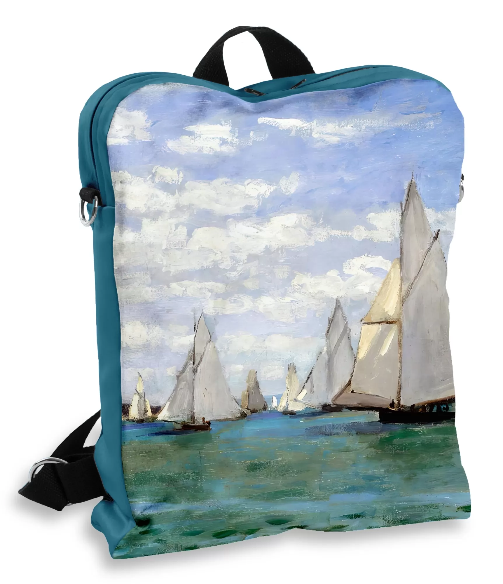 Ši moteriška kuprinė – tarsi šiltos vasaros dienos atspindys, įamžintas Claude Monet šepetėliu. Paveiksle „The Regatta at Sainte-Adresse“ dominuoja ramūs horizontai, gaivus vėjas ir baltais burių trikampiais nusagstyta jūra. Ant kuprinės šios scenos atgyja švelniomis pastelėmis: dangiškai žydras vanduo pereina į šiltą smėlio krantą, o raudonų stogų siluetai tolumoje primena ramią pajūrio popietę. Čia nėra skubėjimo – tik šviesa, spalvos ir kvietimas pasinerti į įspūdžius. Tai aksesuaras moteriai, kuri vertina ne tik stilių, bet ir istoriją, kurią nešiojasi su savimi.