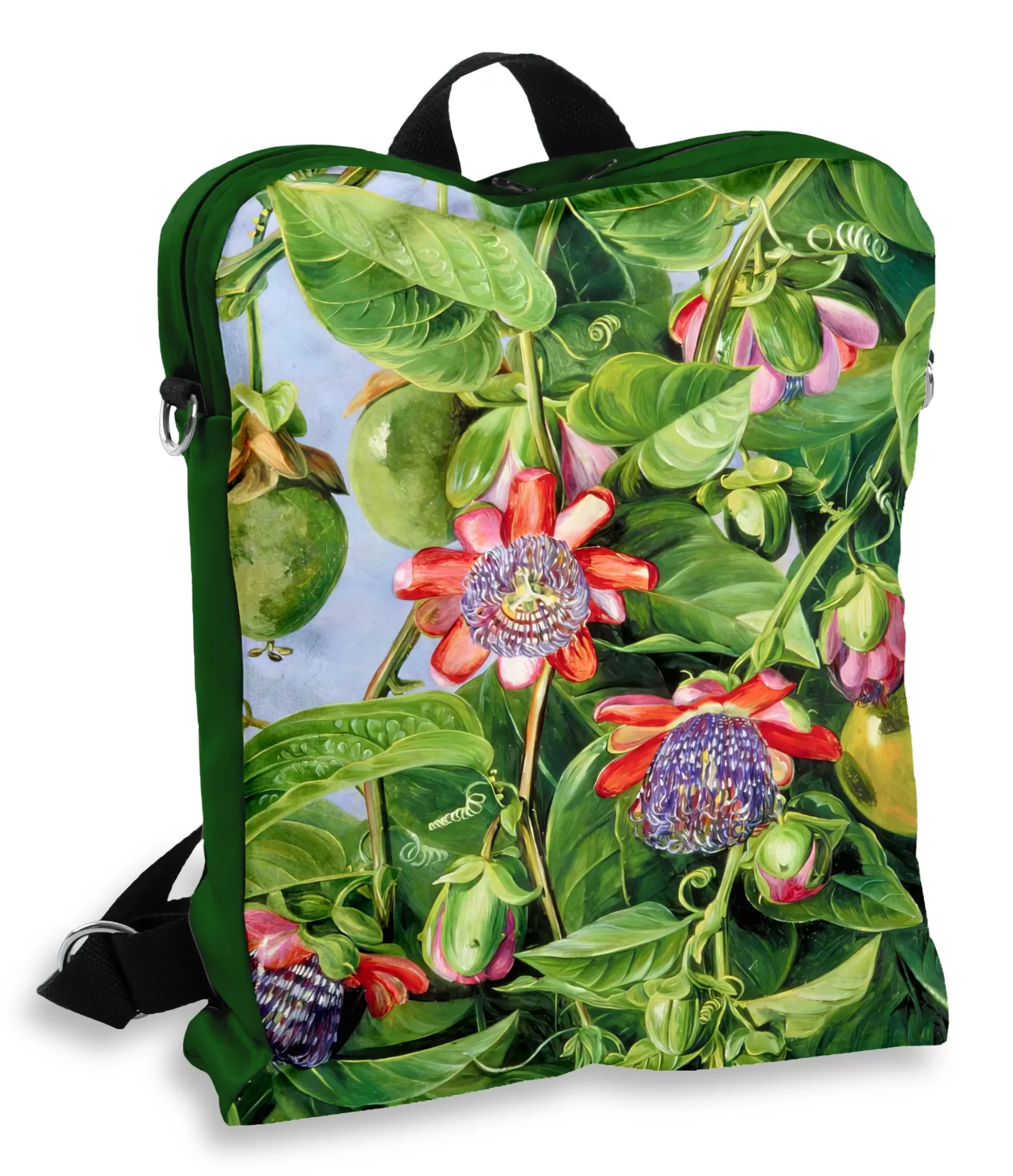 Šios kuprinės širdyje – Marianne North kūrinys, kuriame įamžintos Brazilijos pasifloros žiedų ir vaisių formos. Žvilgsnis pagauna intensyvias spalvas: rausvai violetiniai žiedlapiai, geltoni vaisių atspalviai, žali lapų raštai, visa tai susilieja į kupiną gyvybės ir paslapties vaizdinį. Tai nėra tiesiog dekoras – tai botaninis pasaulis, ištisas džiunglių pasakojimas, kuriame kiekvienas žiedas atrodo turįs savo charakterį, savo istoriją. Marianne North – XIX a. keliautoja, menininkė ir gamtos tyrinėtoja – sukūrė šį paveikslą su meile ir smalsumu, kurį dabar gali jausti ant savo pečių.