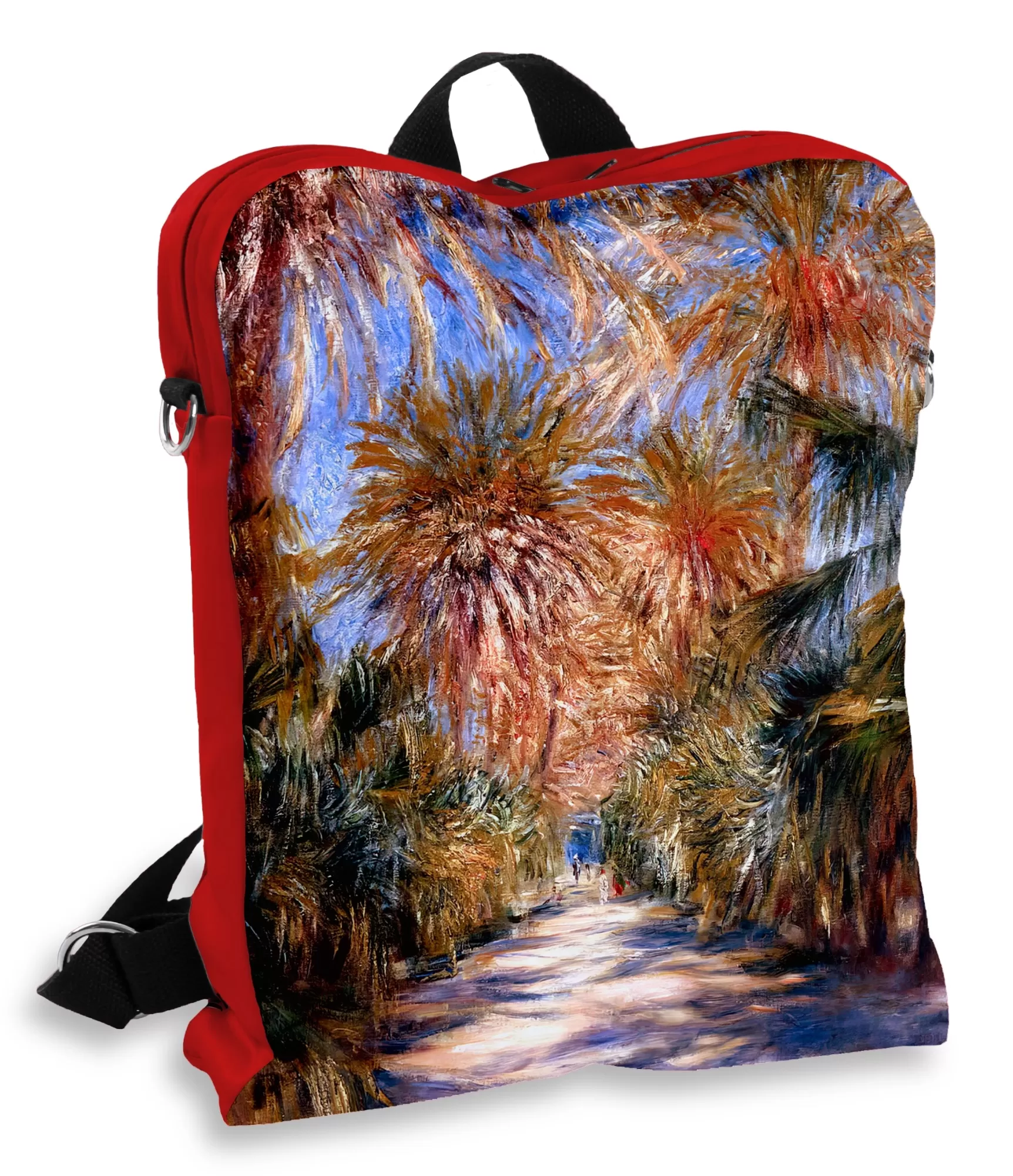 Renoir 1881 m. nutapytas „Algiers, the Garden of Essai“ alsuoja vasaros šviesa: tirštai žali medžiai, sklidini saulės takeliai, švelnūs rožiniai ir mėlyni pustoniai sukuria ramų, bet gyvą pasaulį. Tai ne tik peizažas – tai pojūtis. Lyg būtum giliai kvėptelėjęs šiltą orą sodų alėjoje. Šis vaizdas, perkeltas ant kuprinės paviršiaus, tampa lydinčia būsena – švelnia, jausminga ir kviečiančia sulėtinti.