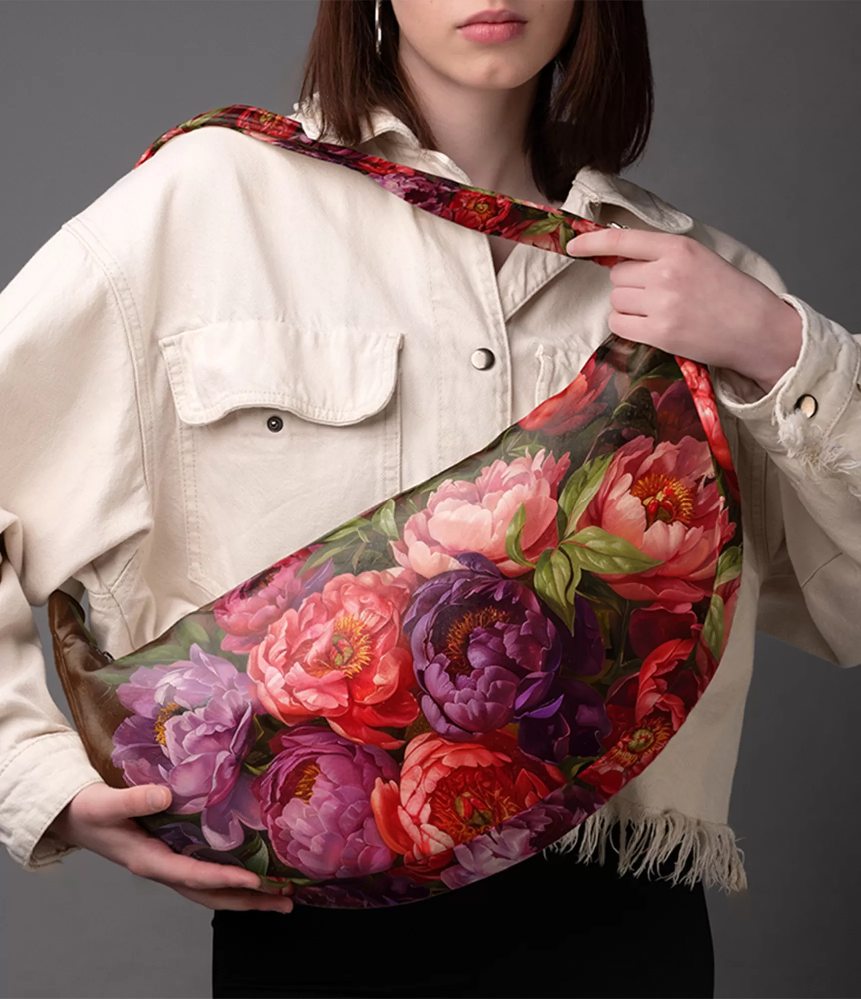 Rankinė su reguliuojamomis rankenomis leidžia ją patogiai nešioti rankoje, ant peties arba per kaklą. Dėl šios universalios rankenos galite lengvai pritaikyti rankinės nešiojimą pagal savo poreikius. Tai puikus pasirinkimas kasdienai, suteikiantis tiek komfortą, tiek stilių. Rankinė su bijūnais prideda elegancijos ir švelnumo jūsų įvaizdžiui. Gėlėti raštai suteikia šiai rankinei unikalumo ir išskirtinumo. Tai puikus pasirinkimas tiek kasdienai, tiek ypatingoms progoms, kai norisi pabrėžti savo individualumą.