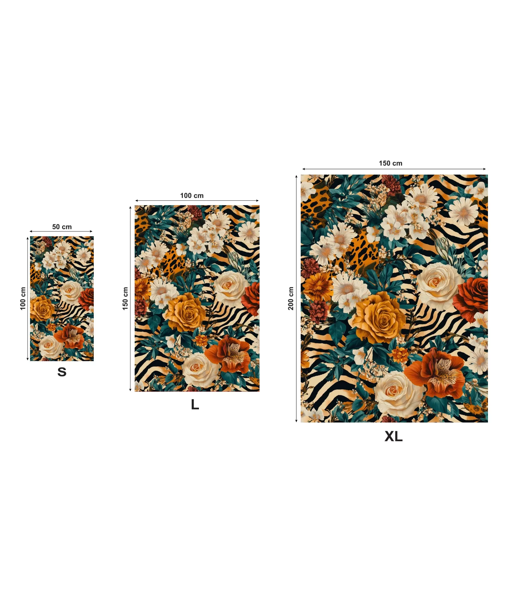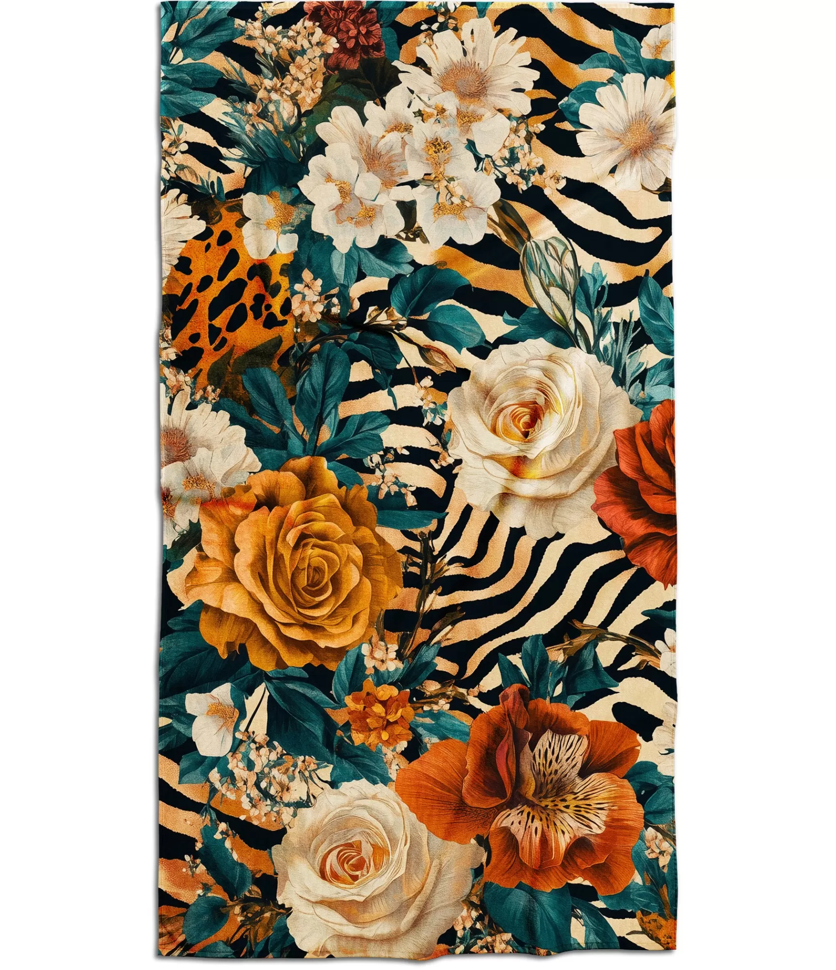 Šie dvisluoksniai rankšluosčiai išsiskiria nepaprastu dizainu, kuriame sujungti džiunglių laukinės faunos raštai ir sodrūs žiedai sukuria intensyvų, egzotišką peizažą. Viena rankšluosčio pusė puošta gėlėmis ir gyvūnų raštais – tigro dryžiai susilieja su rožių, ramunių ir tropinių žiedų žaisme. Spalvos drąsios ir gilios: sodriai oranžinės rožės, degintos raudonos aguonos, vanilinės baltos gėlės ir tamsūs žali lapai išsiskiria dinamiškame fone. Kontrastingas zebro dryžių motyvas dar labiau sustiprina įspūdį ir suteikia dizainui laukinės elegancijos. Kita pusė – švelni balta 100 % medvilnė, sukurta patogiam šluostymuisi. Dėl šio sluoksnio rankšluostis ne tik išsiskiria vaizdu, bet ir yra praktiškas – sugeriantis, minkštas ir malonus odai. Idealus pasirinkimas tiems, kurie vertina tiek estetiką, tiek funkcionalumą.