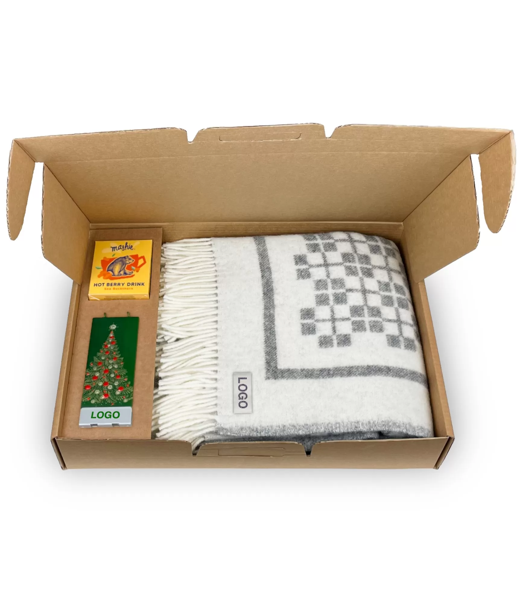 Komplektą sudaro vilnonis pledas, žvakė, arbata ir dovanų dėžutė be logotipų. Personalizavimo paslaugos užsakomos atskirai.