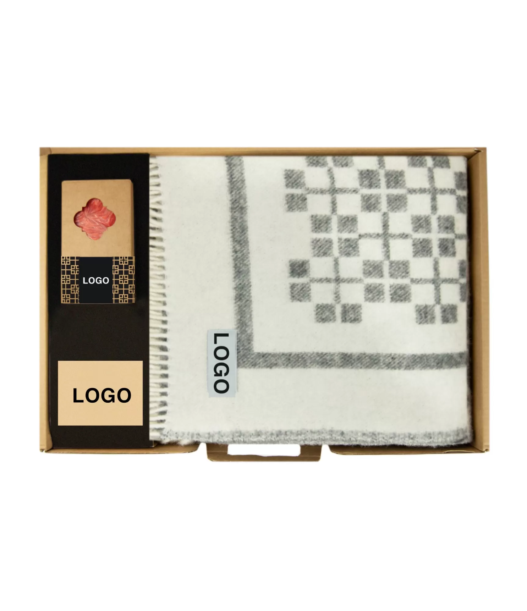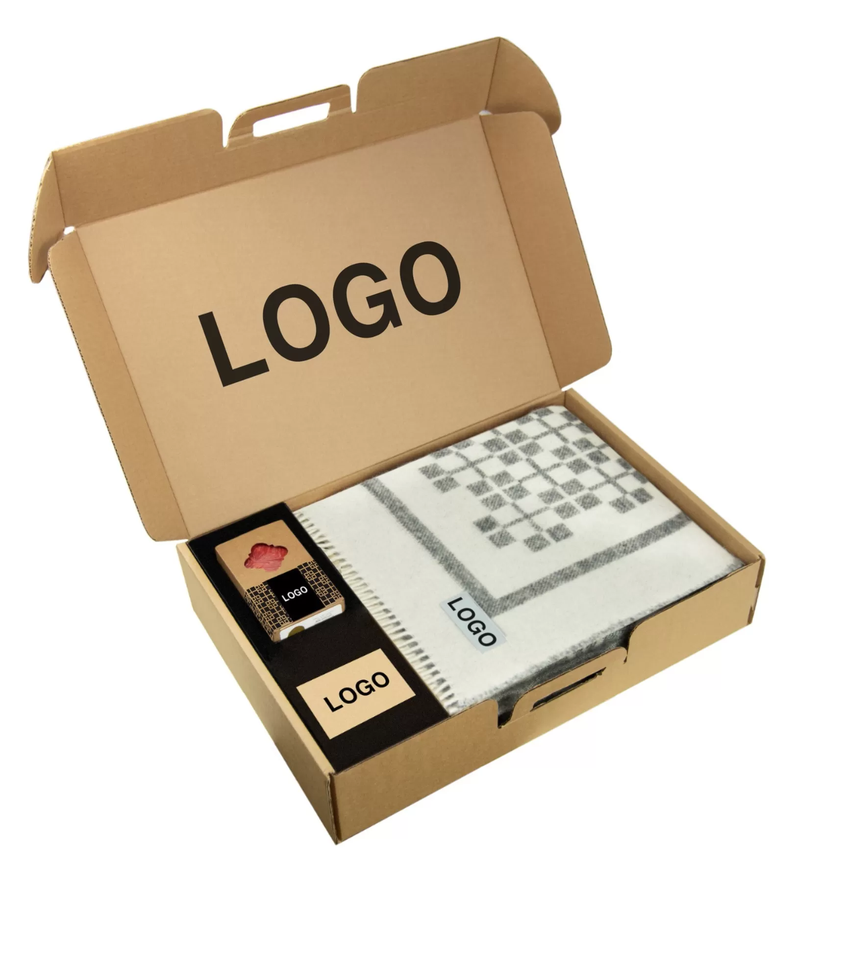 • Komplektą sudaro dėžutė, vilnonis pledas ir žvakė be įmonės logotipų.