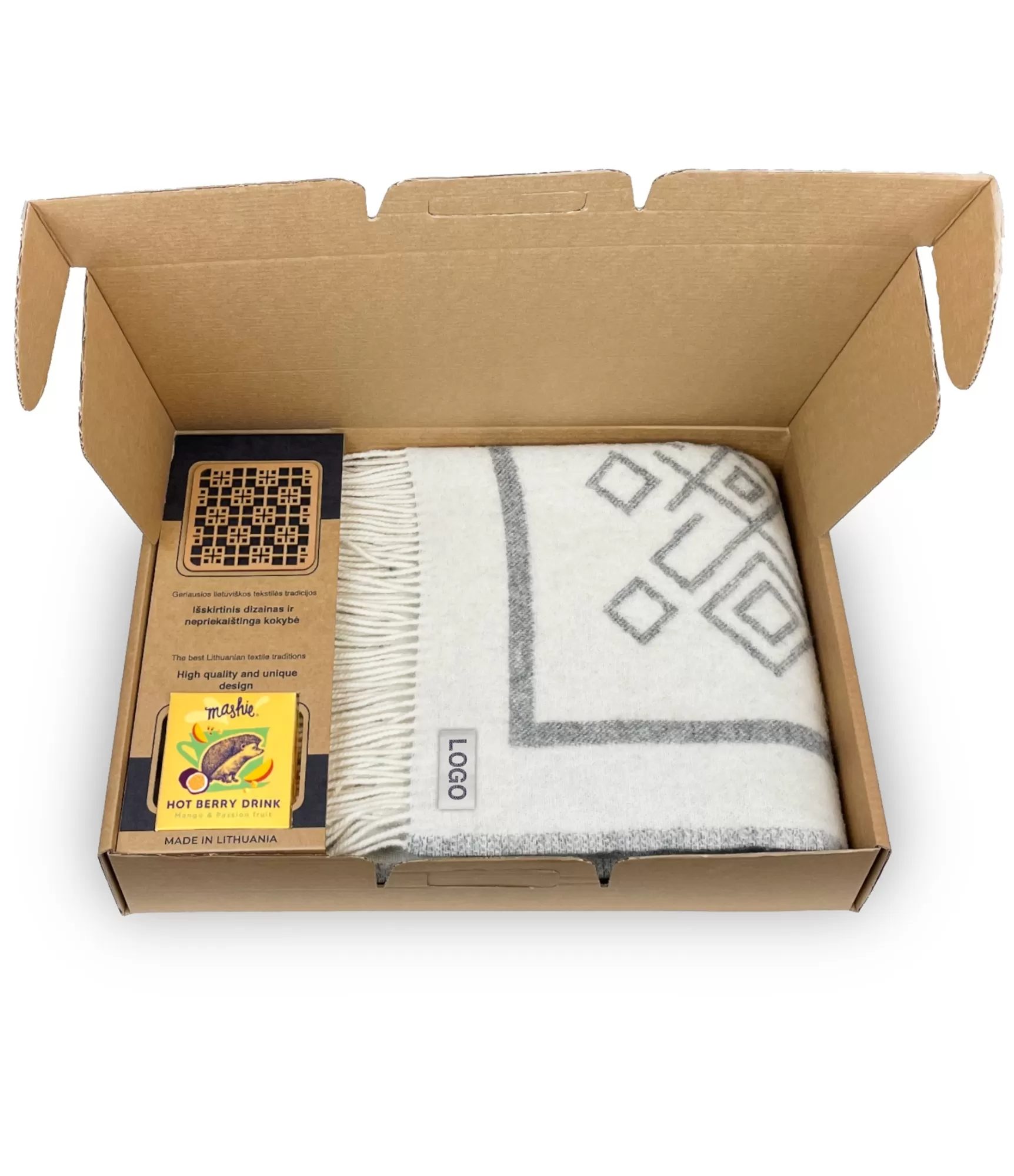 Komplektą sudaro vilnonis pledas, medinis padėkliukas, arbata ir dovanų dėžutė be logotipų. Personalizavimo paslaugos užsakomos atskirai.