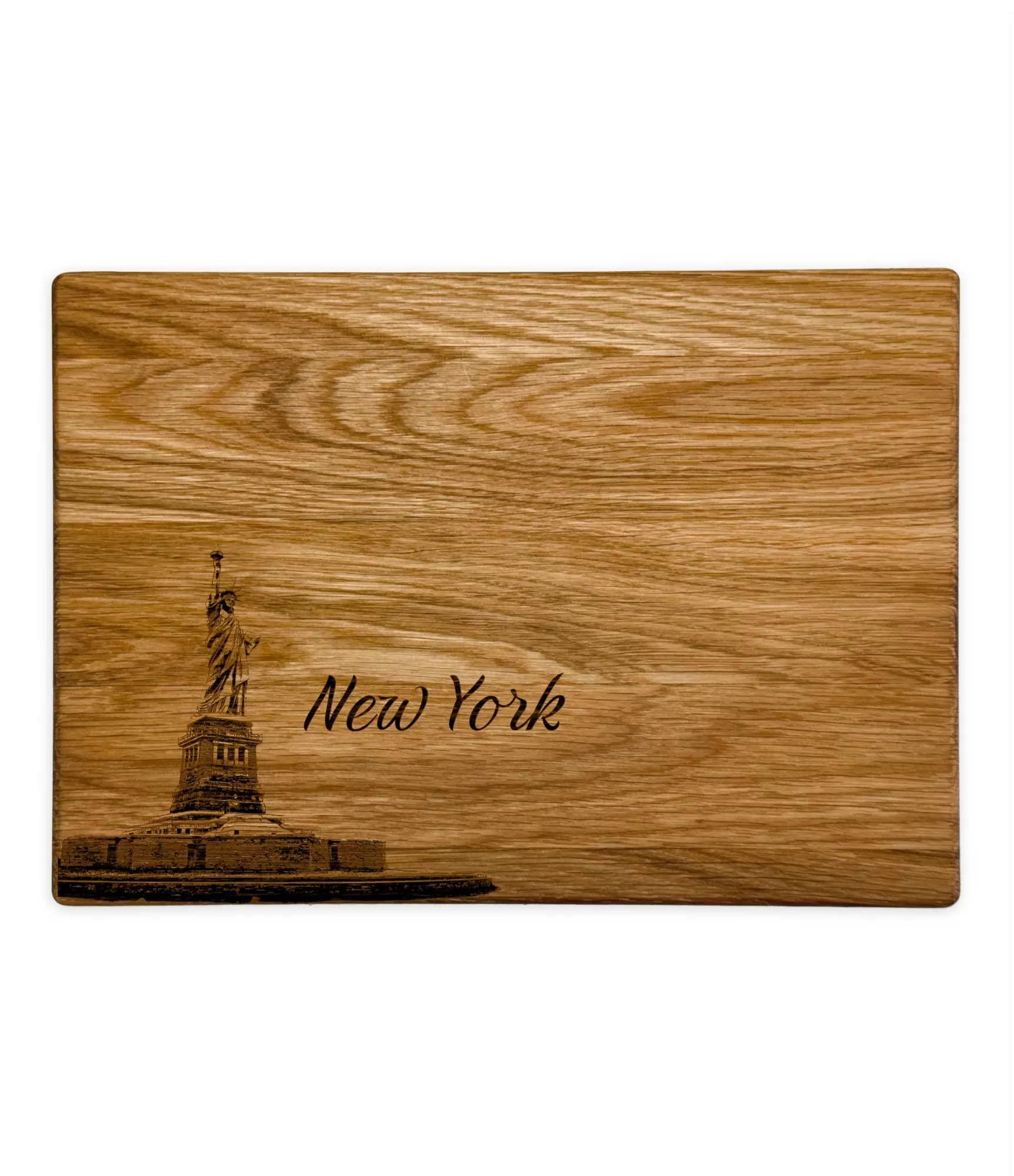 Medinė pjaustymo lentelė su Niujorko siluetu – tai išskirtinė dovana, kuri simbolizuoja modernumą, veržlumą ir tarptautiškumą. Graviruoti miesto simboliai, tokie kaip Laisvės statula, Empire State Building ar Bruklino tiltas, iškart atpažįstami visame pasaulyje ir tampa stipriu reprezentacijos akcentu. Papildomas įmonės logotipas ar dedikacija šią lentelę paverčia ne tik praktišku virtuvės įrankiu, bet ir originaliu suvenyru su prasme.