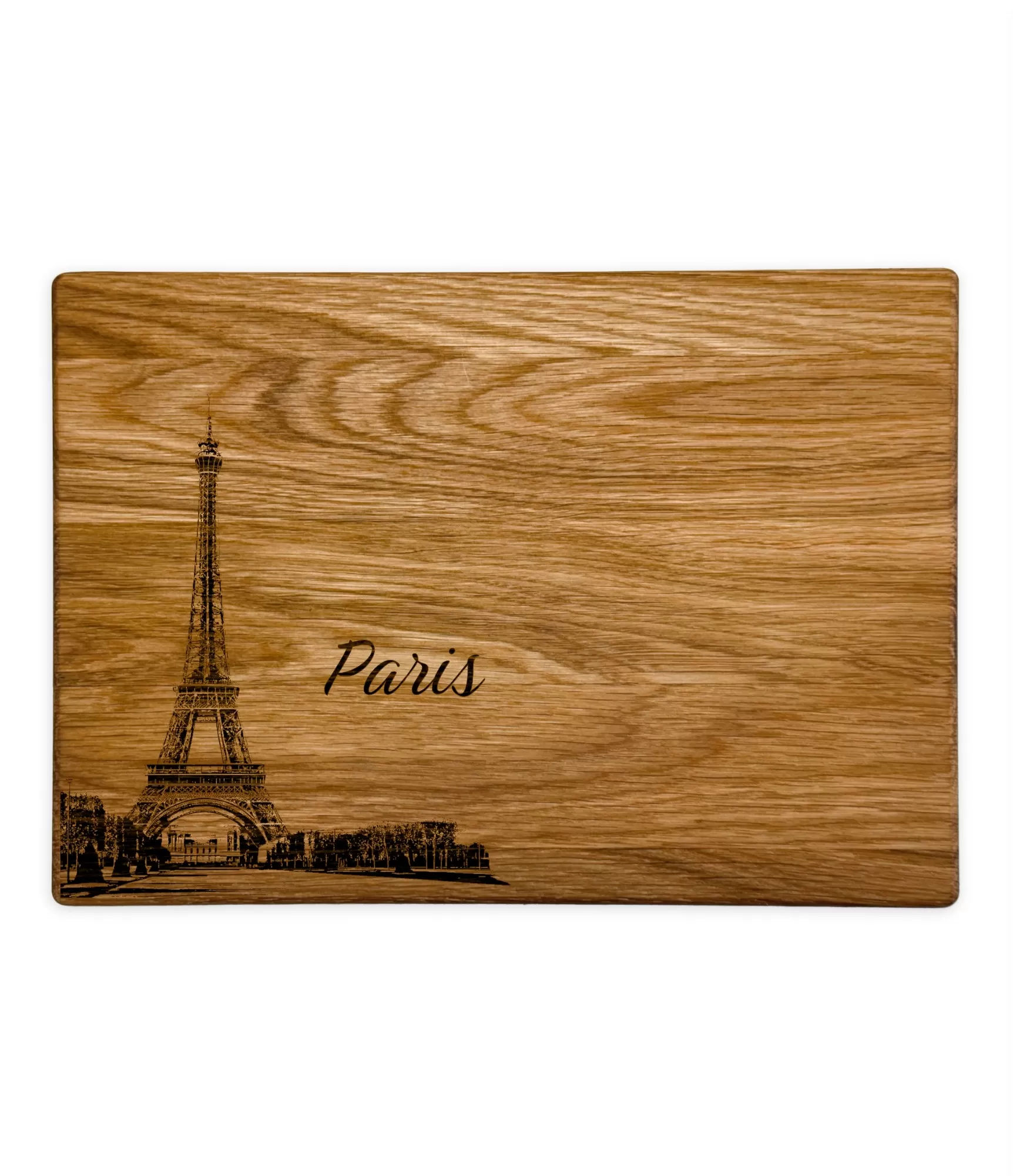 Medinė pjaustymo lentelė su Paryžiaus siluetu – tai ypatinga dovana, kuri sujungia praktiškumą, eleganciją ir kultūrinę prasmę. Graviruota miesto panorama su tokiais simboliais kaip Eifelio bokštas, Triumfo arka ar Monmartro bazilika ne tik primena romantišką Paryžiaus dvasią, bet ir tampa išskirtiniu verslo įvaizdžio akcentu. Ąžuolinė lentelė yra patvari, reprezentatyvi, o papildomas įmonės logotipas paverčia ją unikaliu, personalizuotu gaminiu.