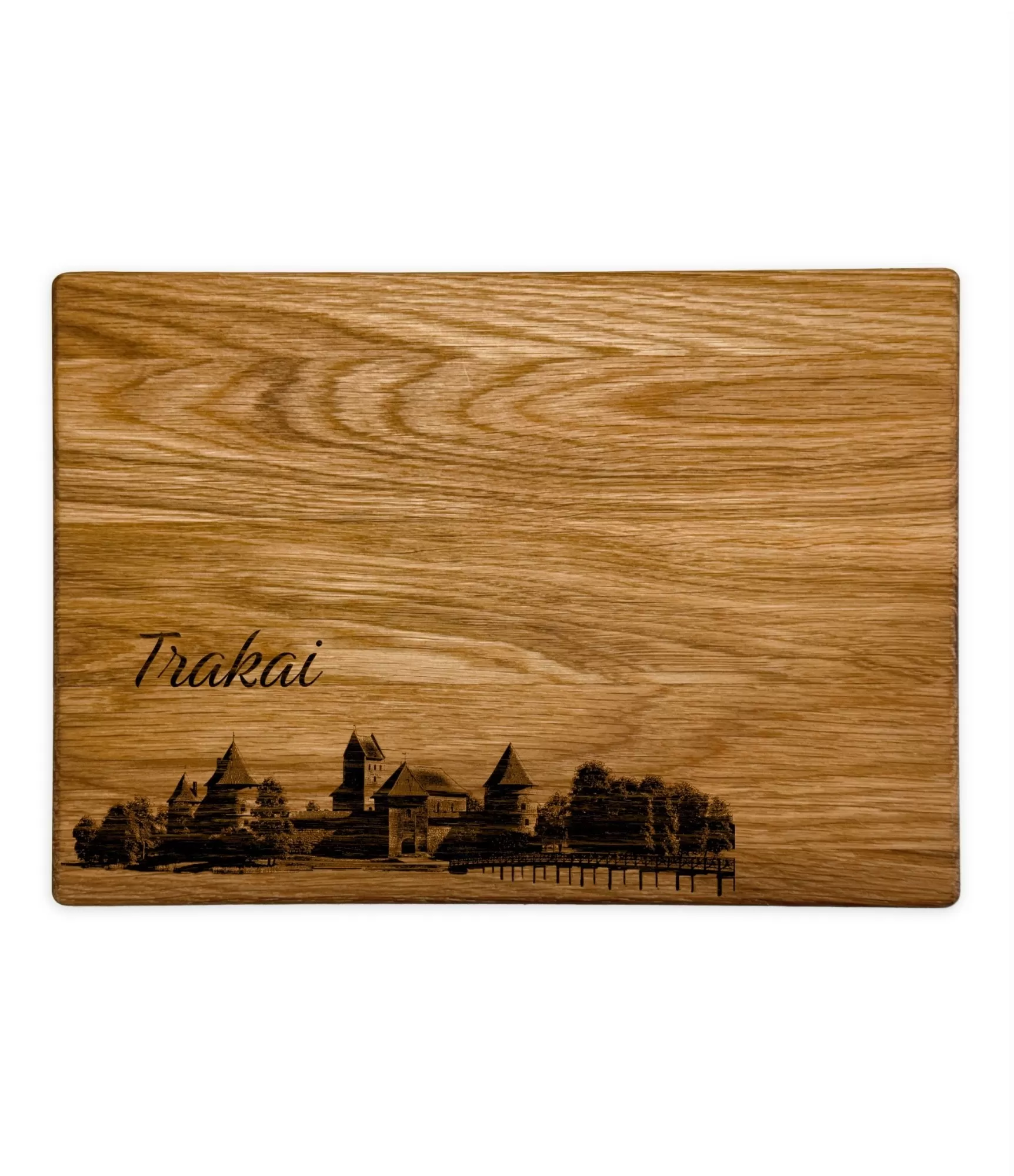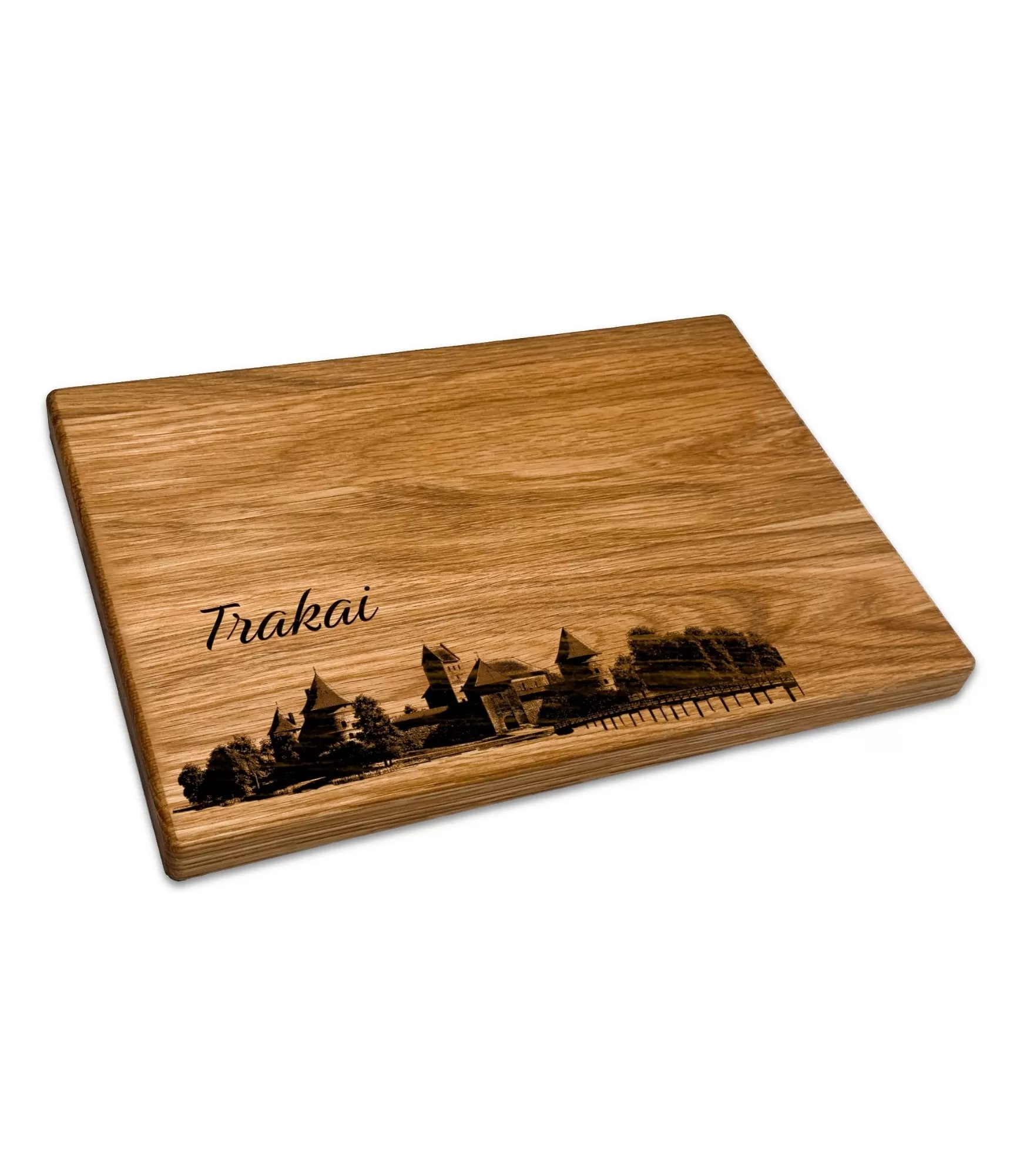 Medinė pjaustymo lentelė su graviruotu Trakų miesto siluetu ar garsiausiais jo simboliais – tai išskirtinė verslo dovanų idėja, kuri jungia praktiškumą ir turizmo vertę. Ąžuolo paviršius užtikrina ilgaamžiškumą, o graviruotas dizainas suteikia dovanai emocinės prasmės. Tokia lentelė gali būti papildyta įmonės logotipu, padėkos užrašu ar net personalizuota žinute, todėl ji tampa ne tik funkcionaliu virtuvės įrankiu, bet ir unikalia atmintimi.