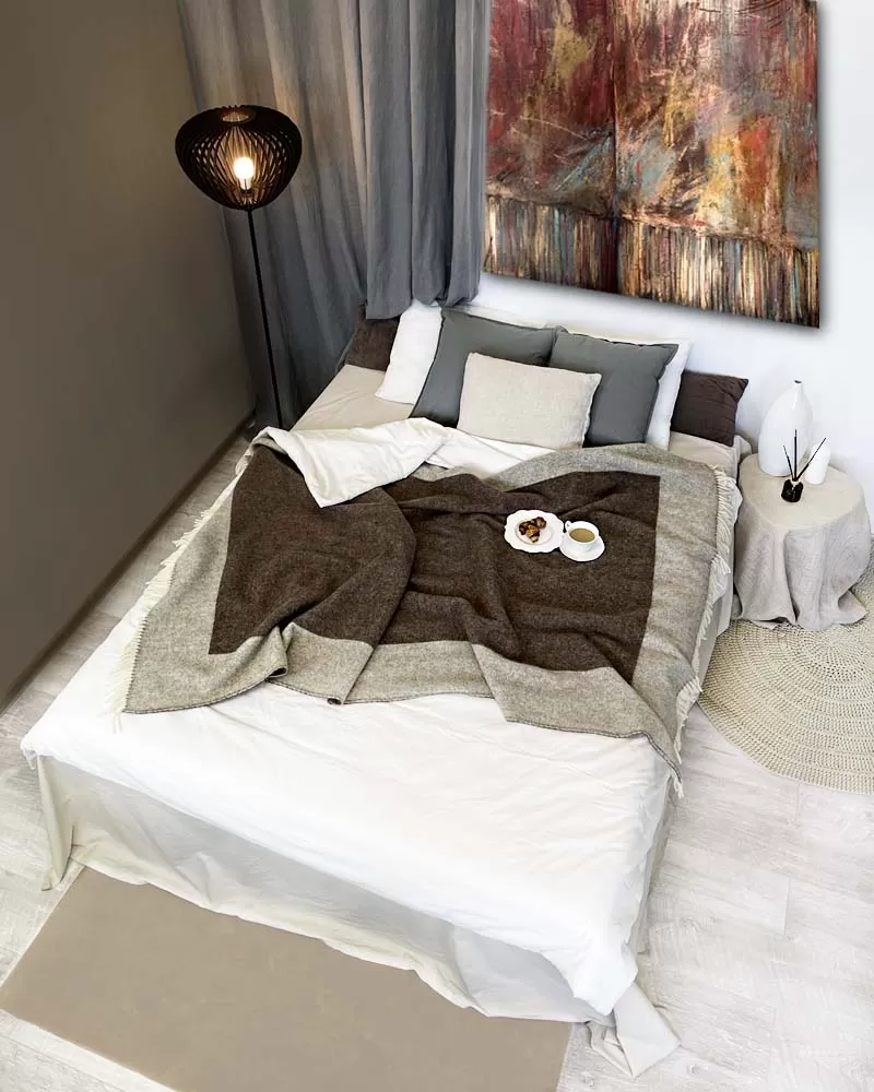 Pledo dizainas aiškiai atsiskleidžia tiek sulankstytas, tiek laisvai užtiestas ant lovos ar sofos. Dideli spalviniai blokai atrodo architektūriškai – jie ne dekoruoja paviršutiniškai, o struktūruoja erdvę. Ant lovos šis pledas tampa dominuojančiu, bet ne agresyviu akcentu, kuris sujungia tekstiles, baldus ir sienų spalvas į vieną harmoningą visumą. Jis puikiai dera su linu, medžiu, akmeniu, matiniais paviršiais ir švelniais pilkais ar smėlio atspalviais.