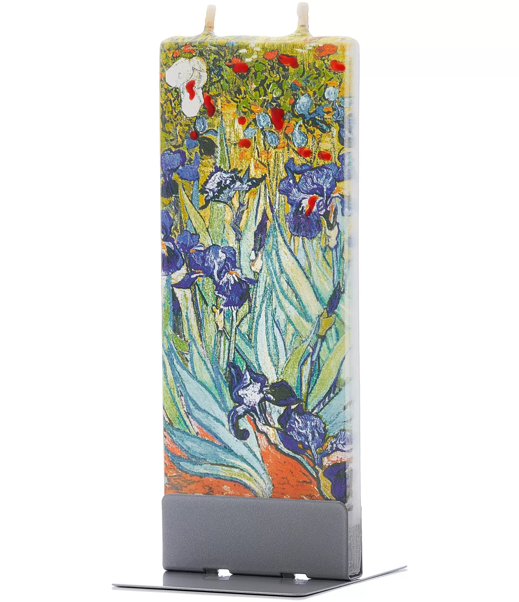 Rankų darbo žvakė "Irises Van Gogh 17K021" leidžia iš arti pajusti Vincento van Gogo meistriškumą ir jo gebėjimą gamtos grožį paversti emocija. Legendinių irisų fragmentas, subtiliai perkeltas ant plokščio paviršiaus, bet kurią erdvę praturtina istoriniu sodrumu bei estetinio grynumo pojūčiu. Gilūs mėlyni atspalviai ir grakščios gėlių linijos čia įgauna naują prasmę, kai minimalistinė forma susitinka su meno šedevru.