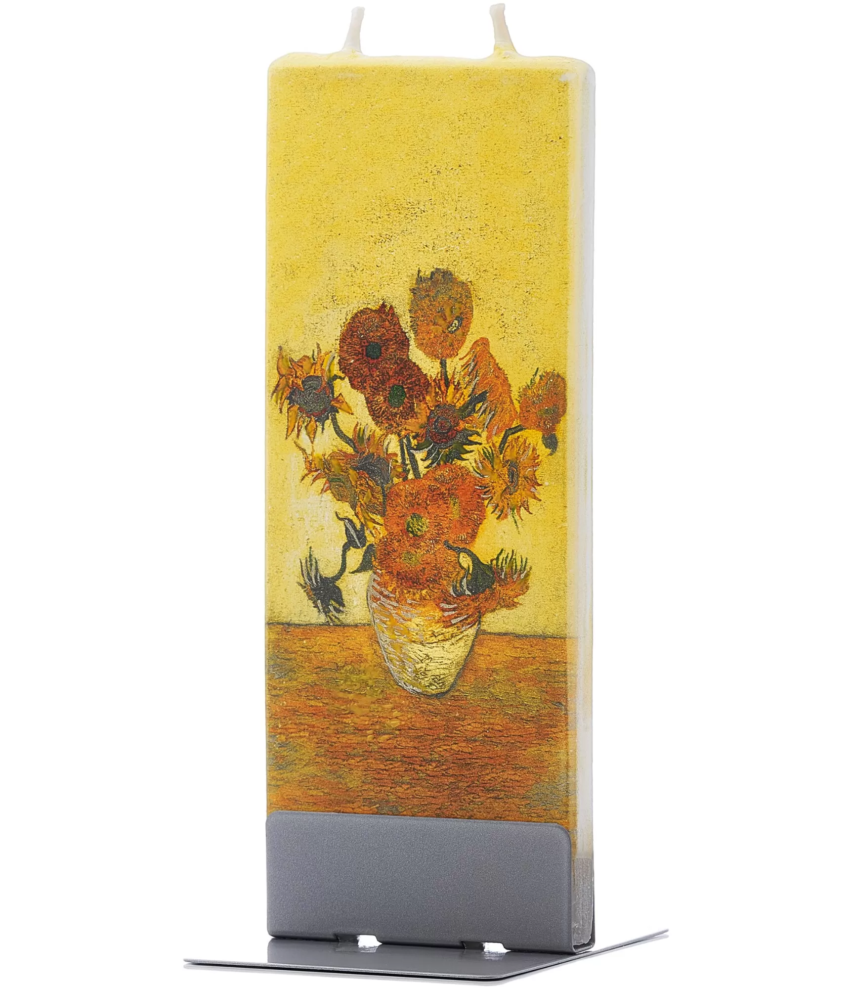 Stilinga žvakė "Sunflowers Van Gogh 17K023" įkūnija Vincento van Gogo aistrą gyvybei ir šviesai. Legendinės saulėgrąžos, subtiliai perkeltos ant plokščio paviršiaus, bet kuriai erdvei suteikia istorinio sodrumo bei estetinio grynumo. Ryškūs geltoni tonai ir energinga paveikslo tekstūra čia įgauna naują prasmę, kai minimalistinė forma susitinka su meno šedevru, paversdama jį stilingu objektu jūsų aplinkoje.