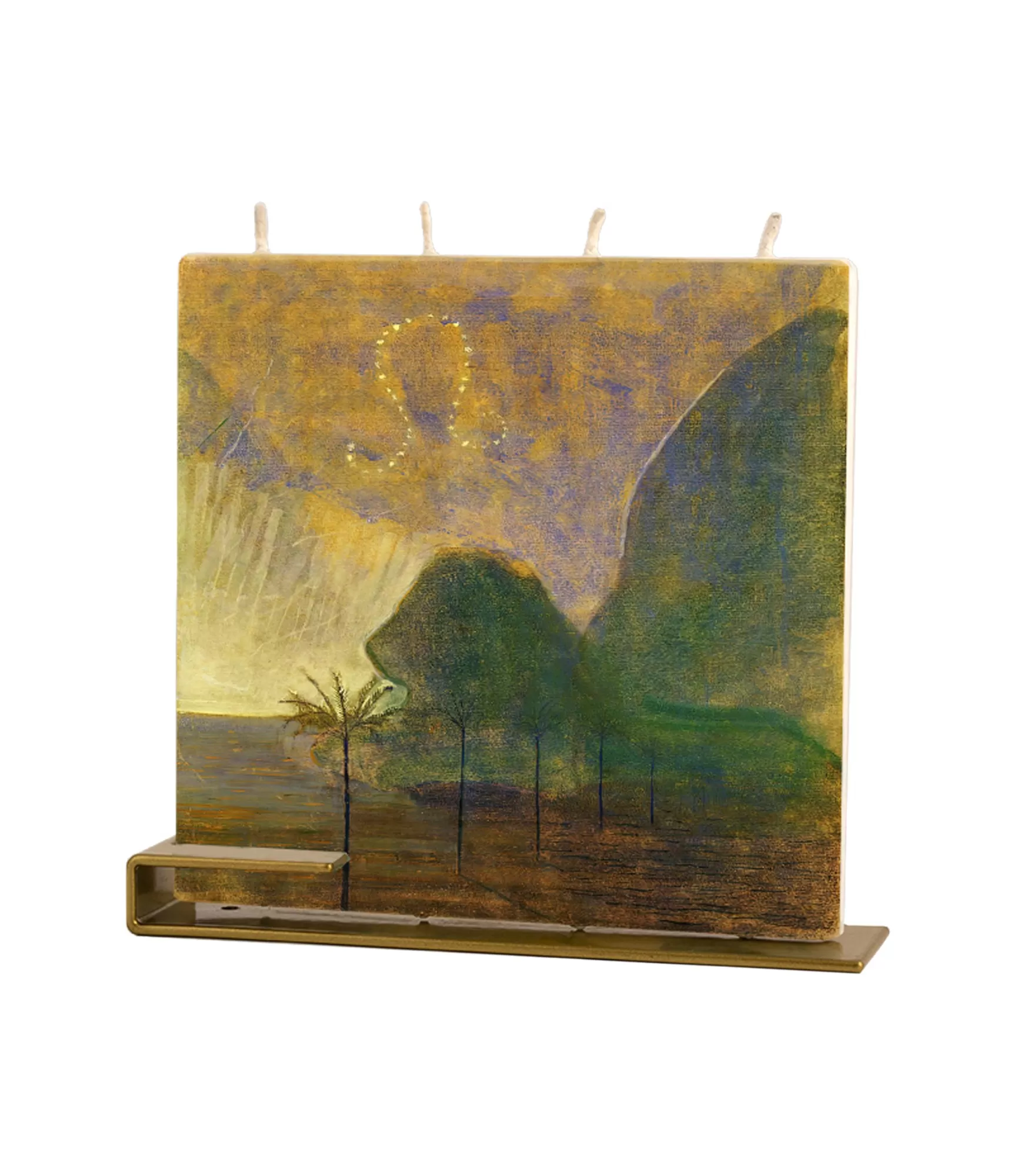 Originali žvakė "Zodiakas Liūtas Čiurlionis S05" – tai ryškus interjero akcentas, kuriame susilieja M. K. Čiurlionio simbolistinis genijus bei modernus dizainas. Ant kvadratinio gaminio paviršiaus atgyjantis Liūto zodiako ženklo paveikslas suteikia gylio bei elegancijos bet kuriai erdvei. Kvadratinė forma paverčia šią žvakę stilingu meno objektu, kuris bet kuriam namų stiliui suteikia užtikrinto charakterio ir vidinės energijos pojūtį.